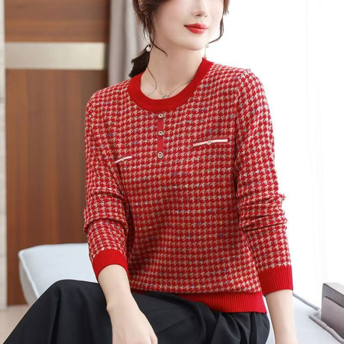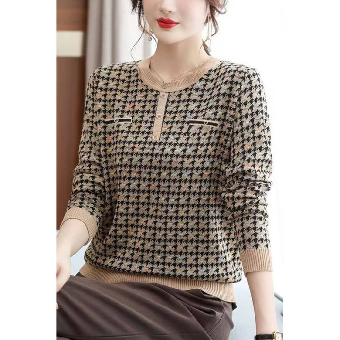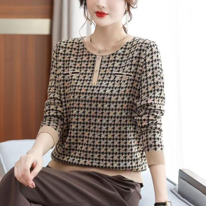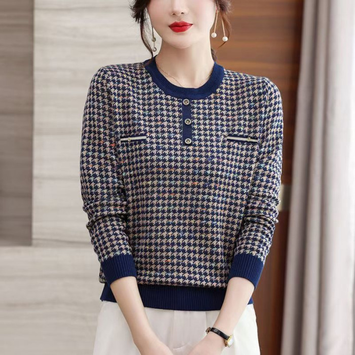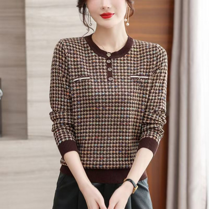 白領哥弟新媽媽春秋薄款毛衣千鳥格洋氣打底衫中老年女士針織小衫