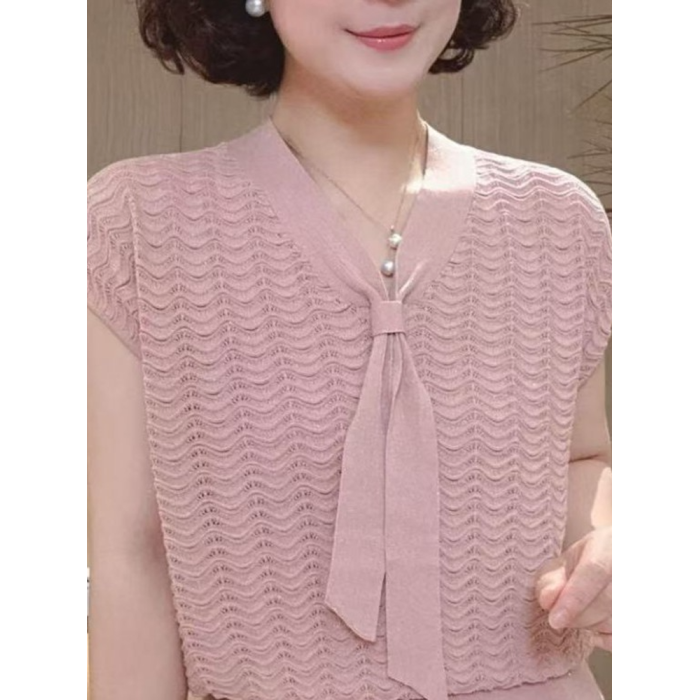 2025夏季新款女裝紅色V領短袖毛針織衫女寬松套頭打底衫時尚洋氣