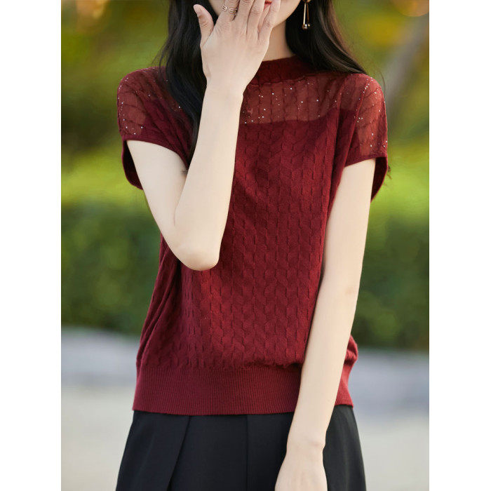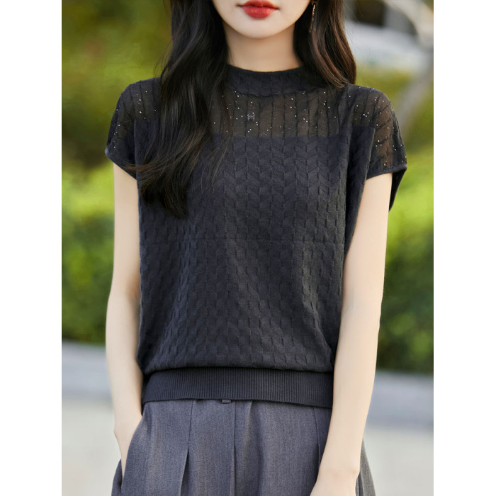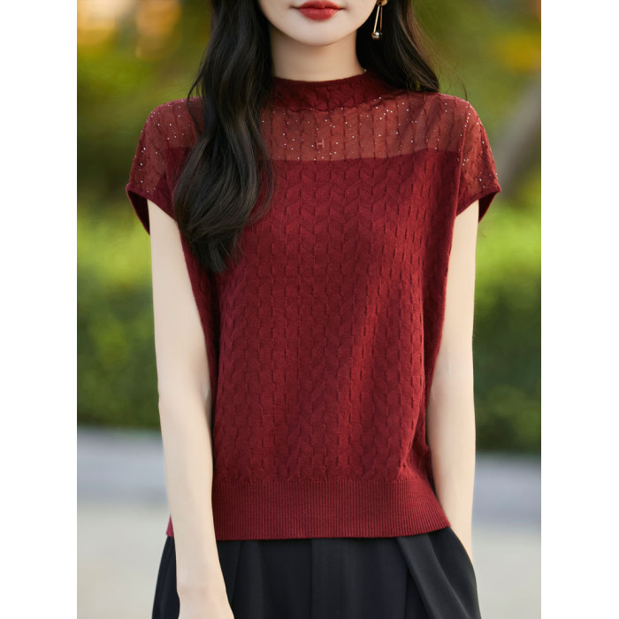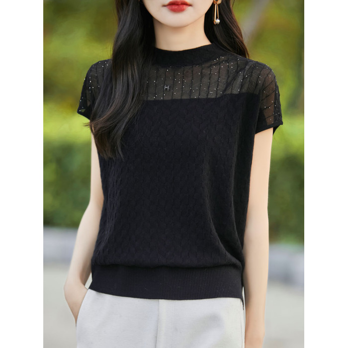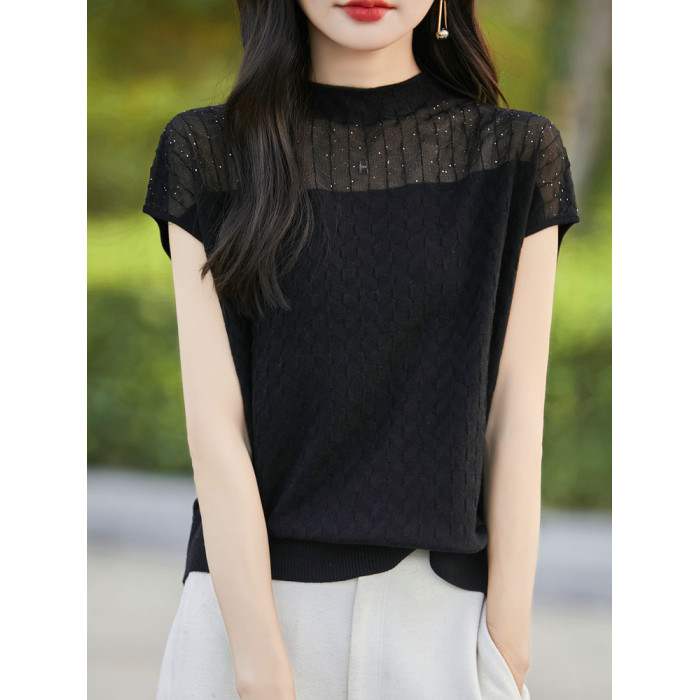 時尚歐根紗半高領短袖女夏季新款蕾絲網紗背心顯瘦百搭針織打底衫