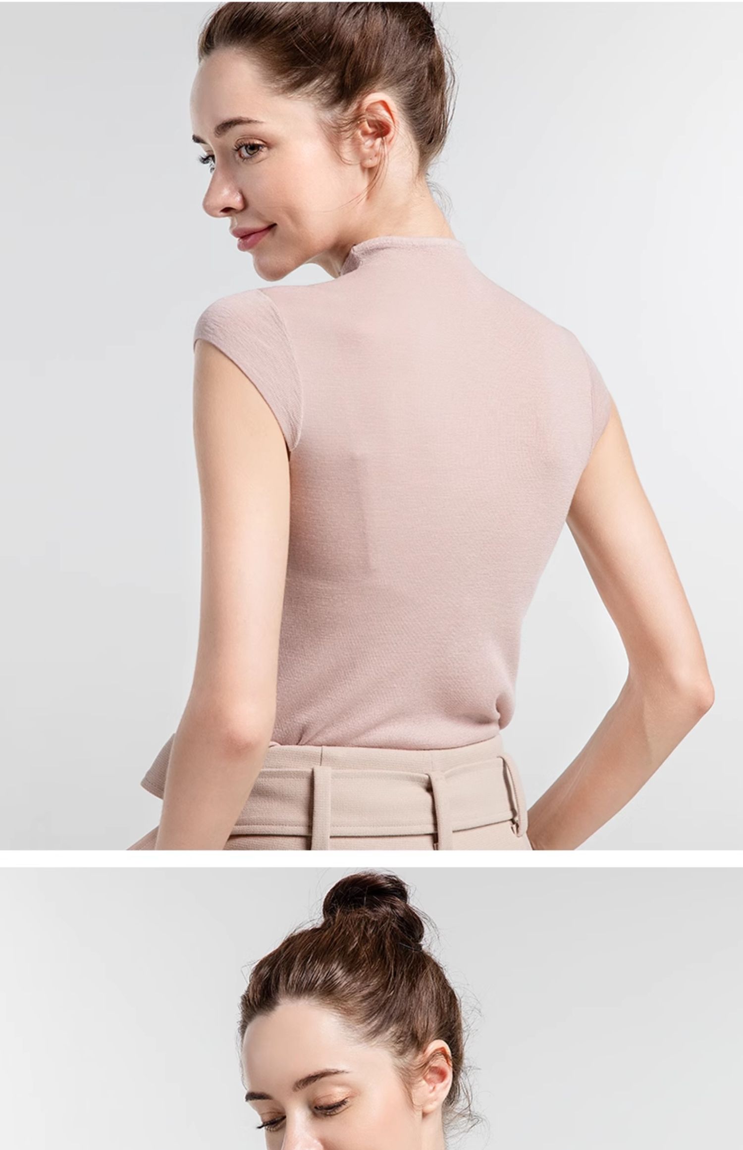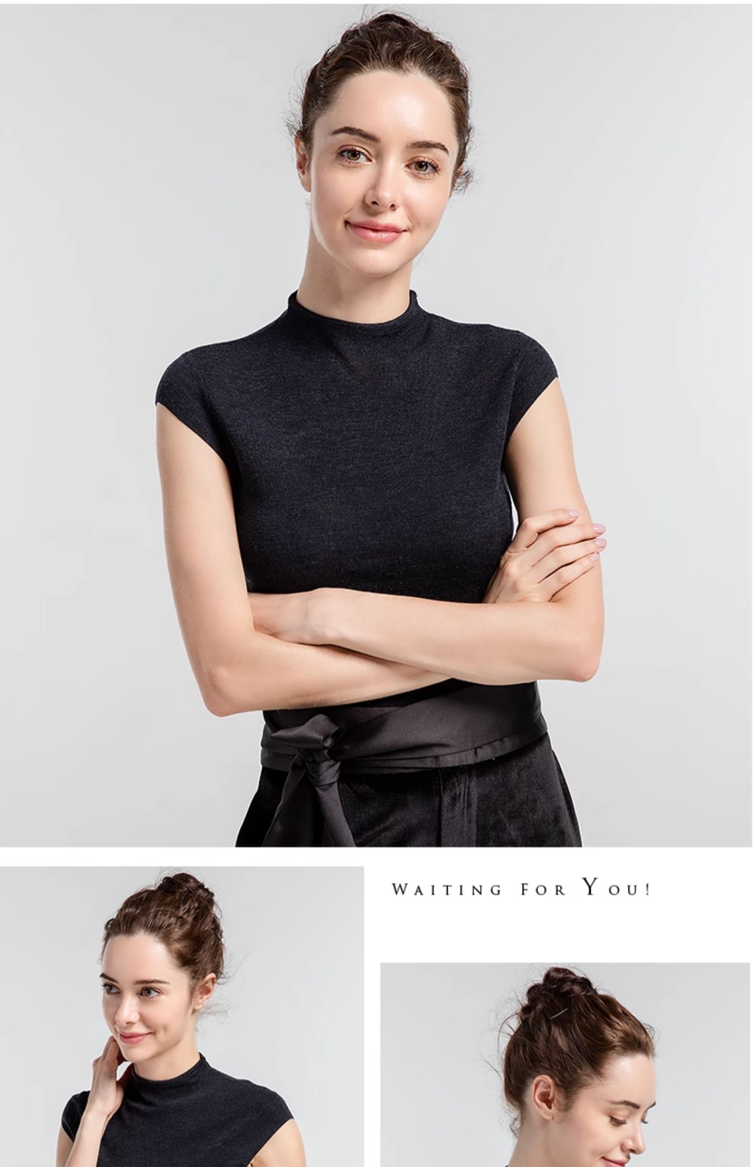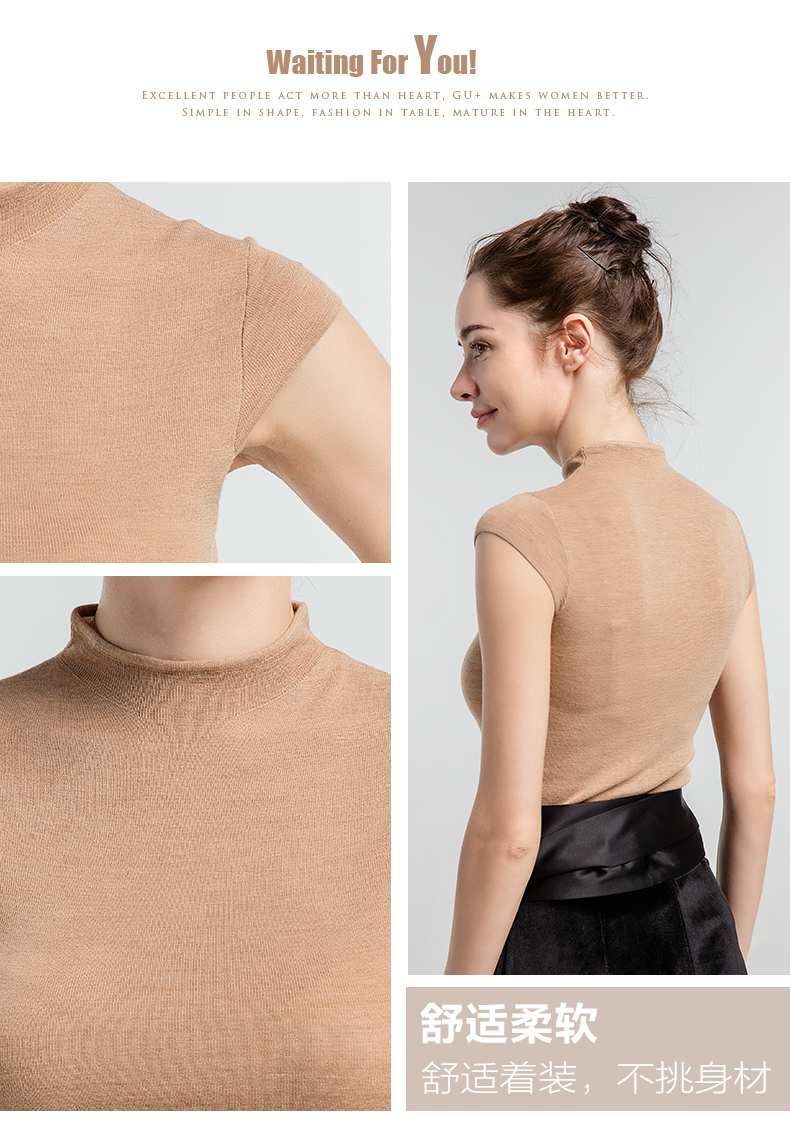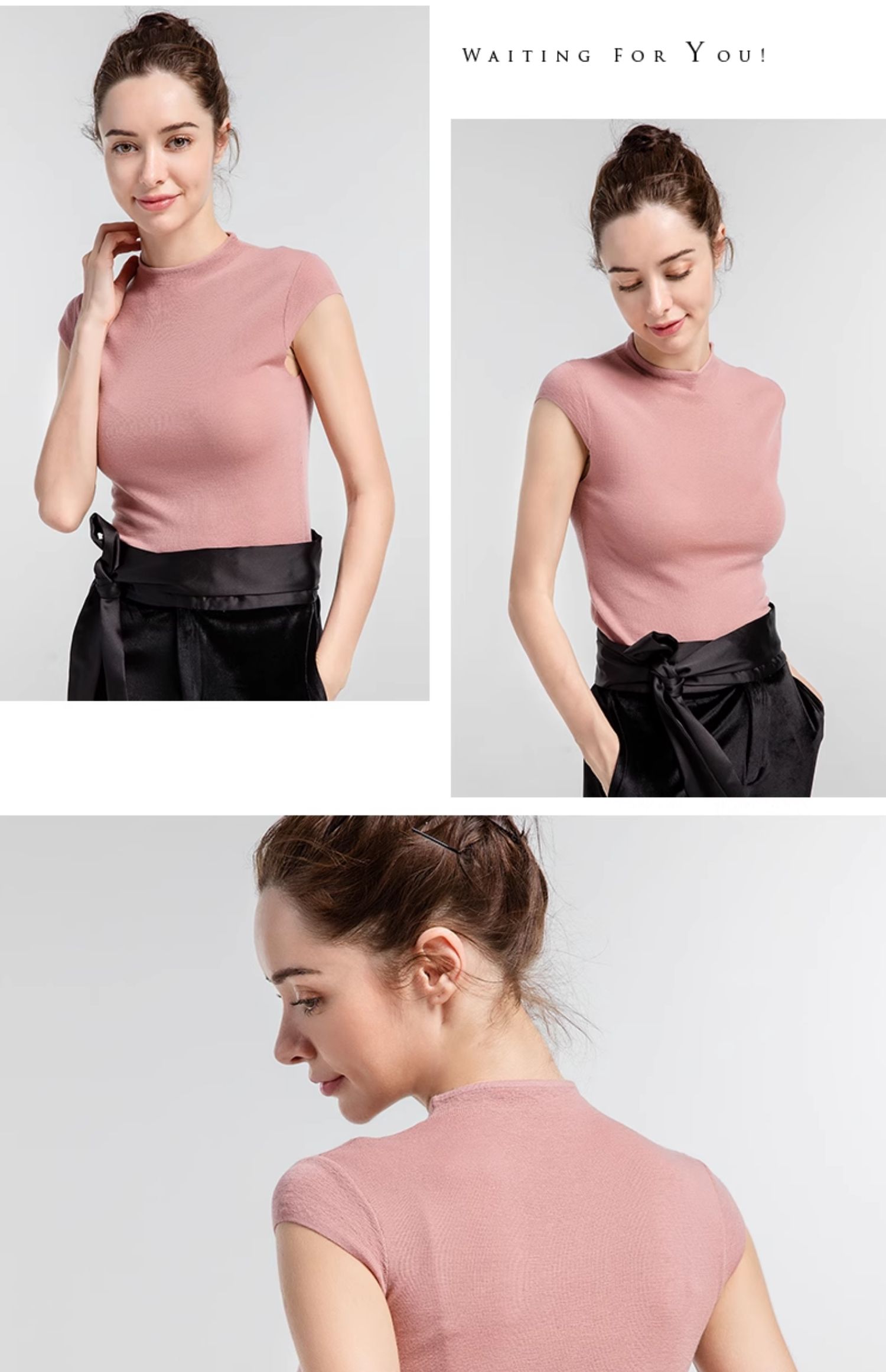 100羊毛針織衫女半高領短袖修身顯瘦純色打底衫春秋新款上衣內搭