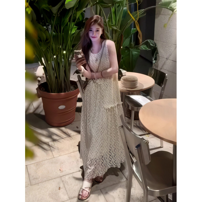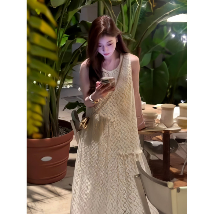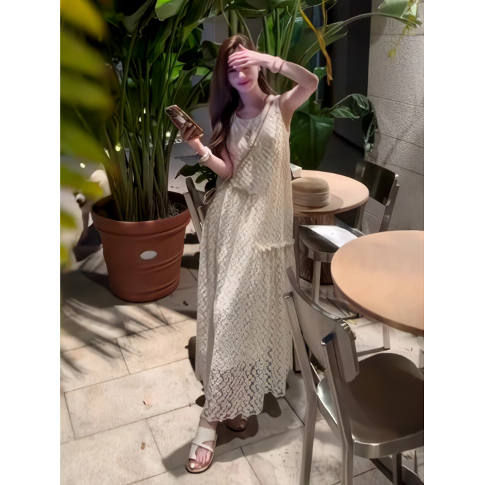 韓系重工蕾絲拼接無袖連衣裙女2025夏季鉤花設計感寬松顯瘦中長裙