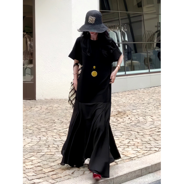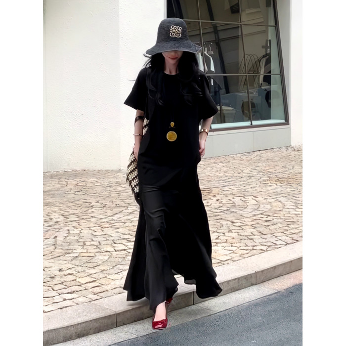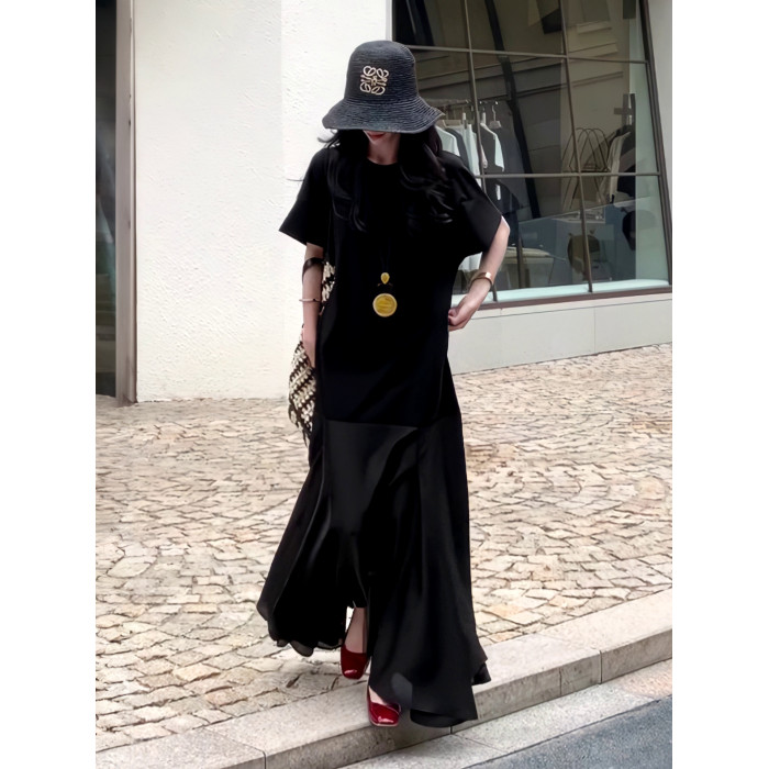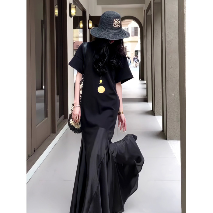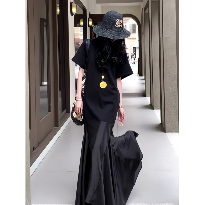 韓系黑色長款T恤連衣裙女2025夏季新款短袖體恤裙拼接網紗魚尾裙
