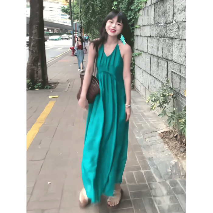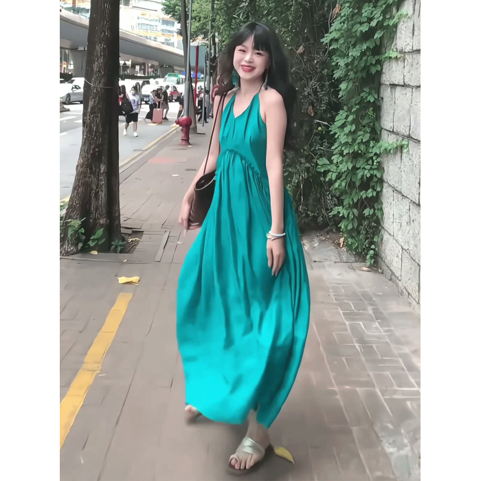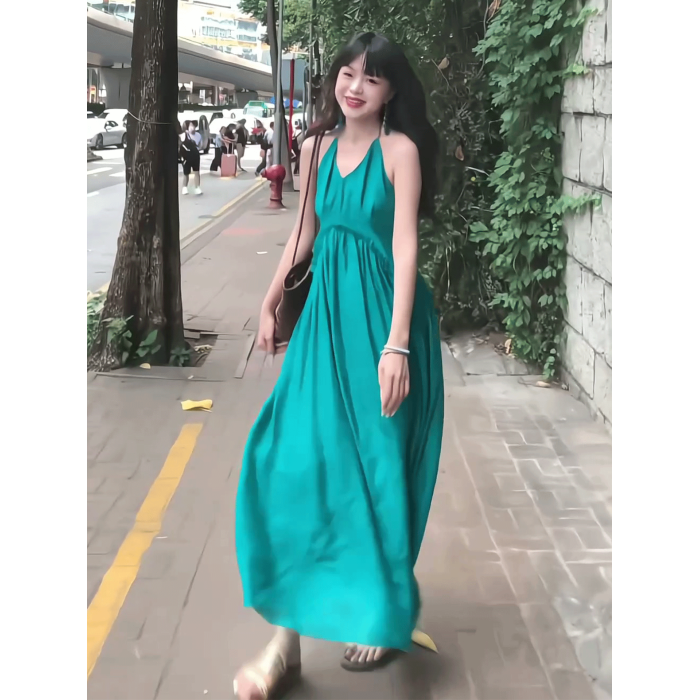 純欲性感大露背v領掛脖綁帶吊帶連衣裙女夏季拍照沙灘裙仙女長裙