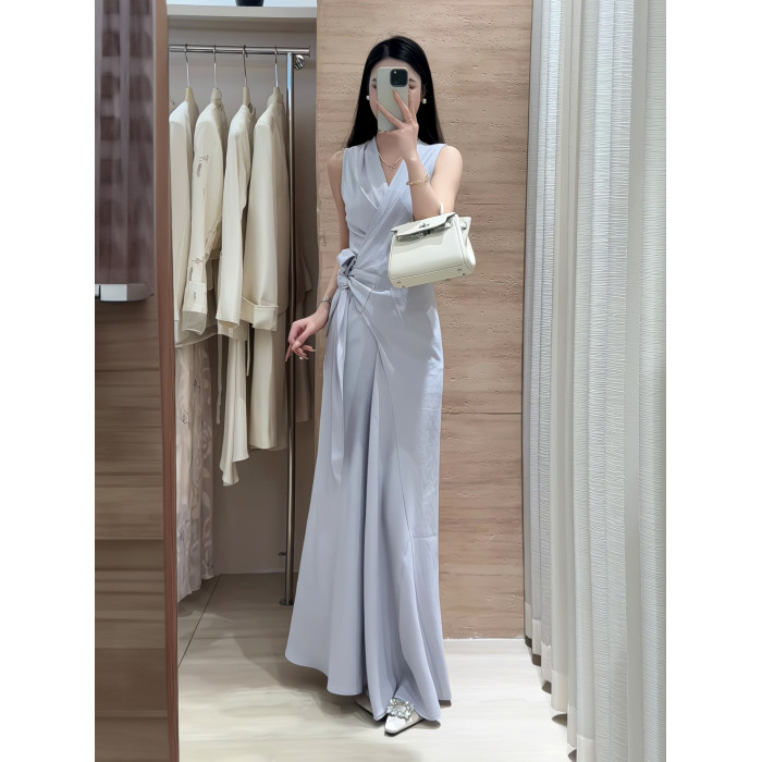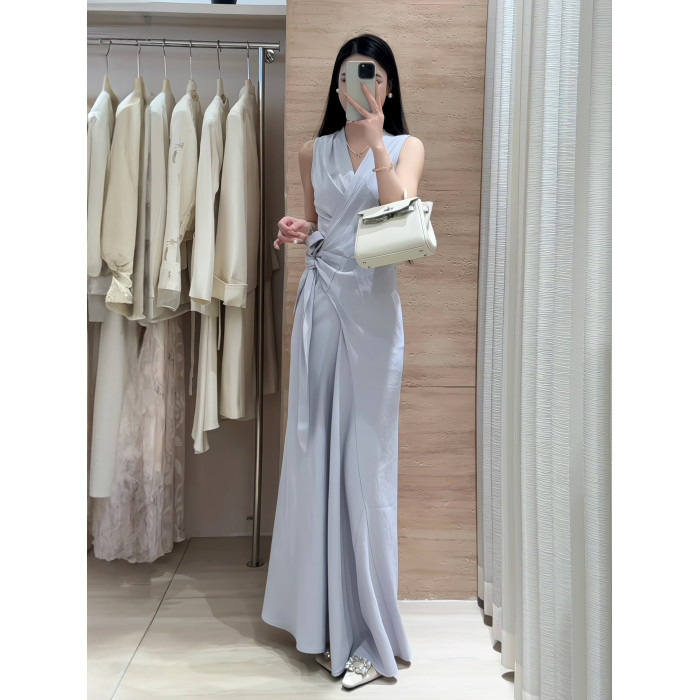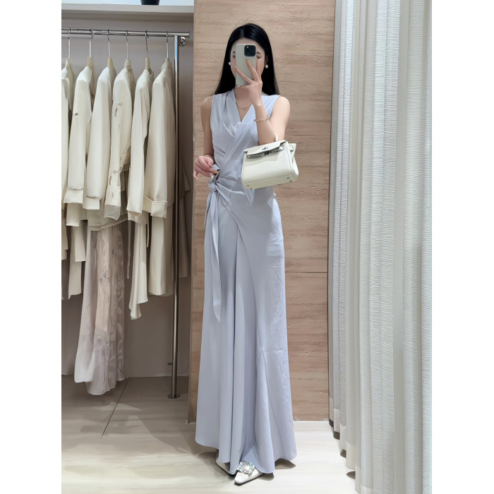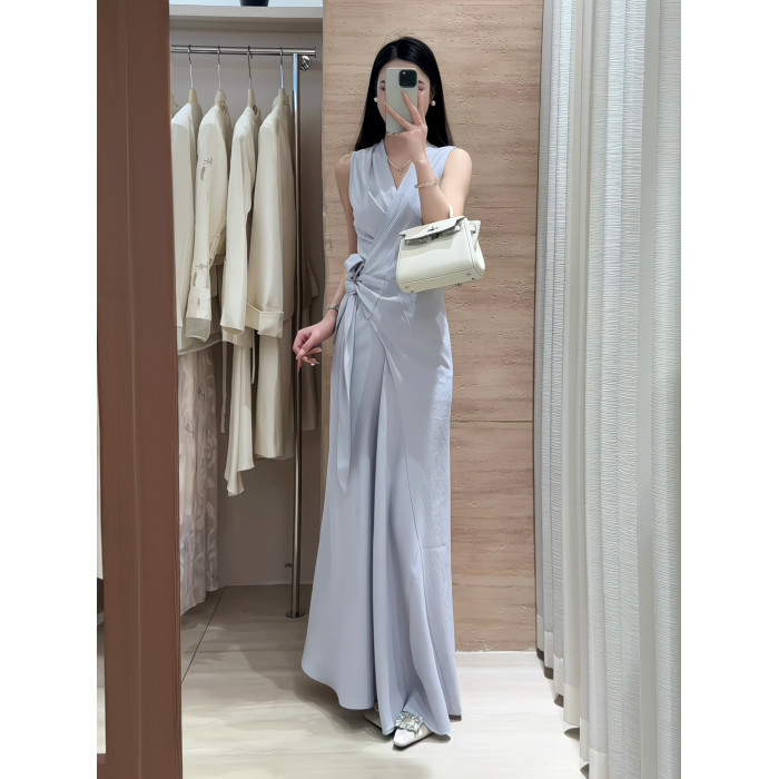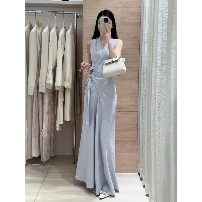 2025新款高級感氣質裹身系綁無袖連衣裙女夏季收腰顯瘦V領長裙