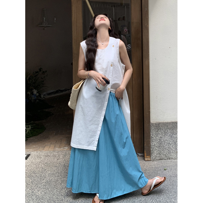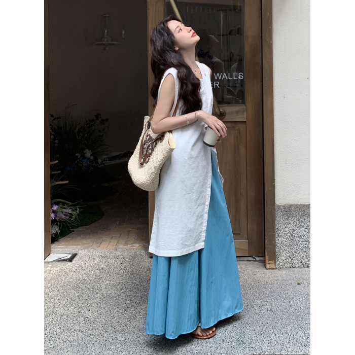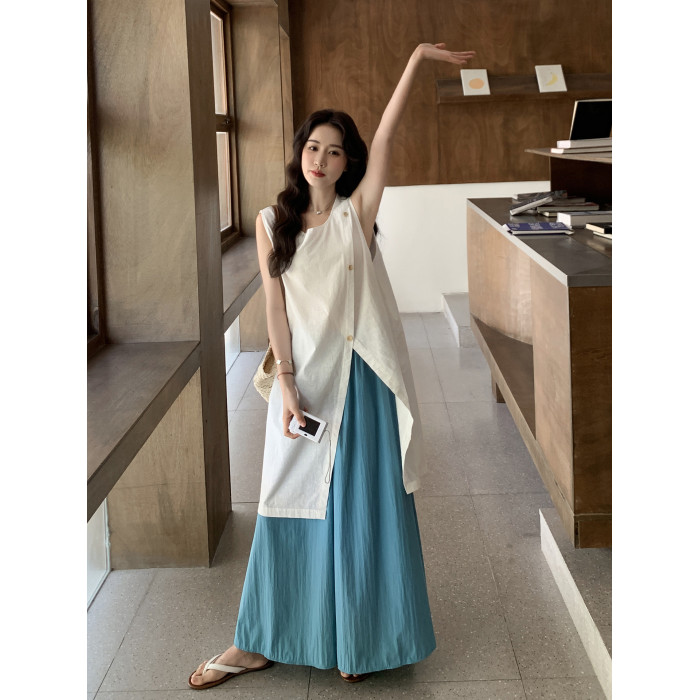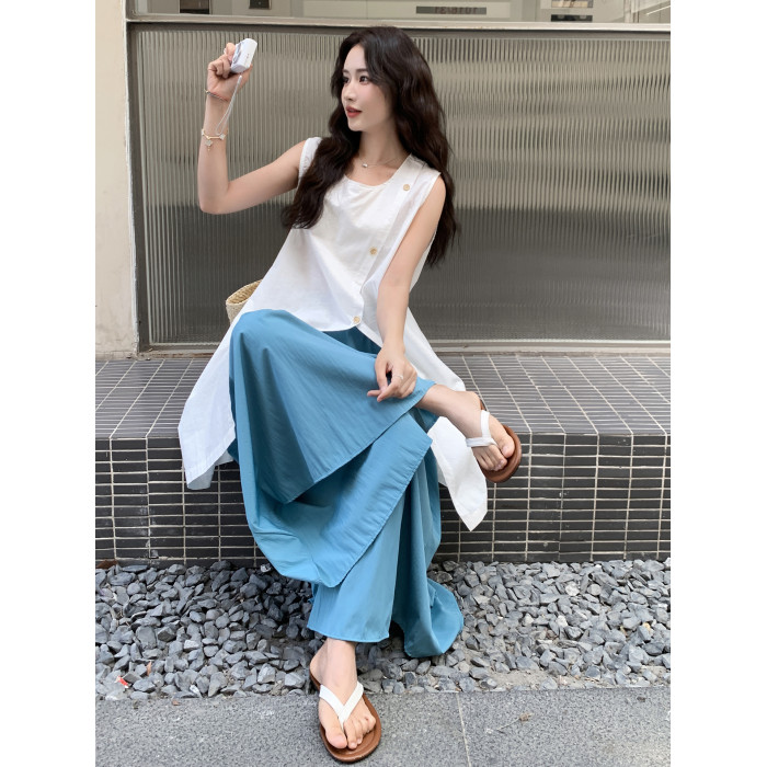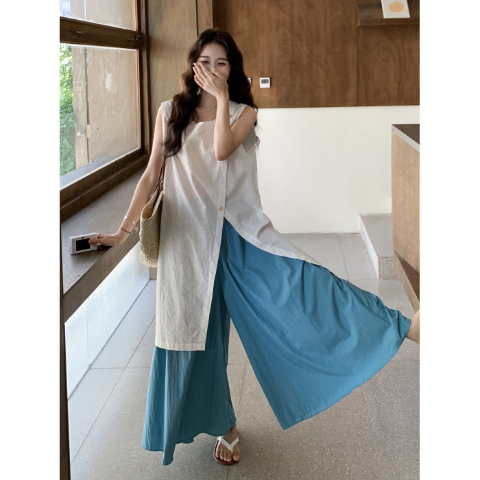韓系開叉襯衣連衣裙濶腿褲女夏松弛感寬松顯瘦氣質上衣裙褲兩件套