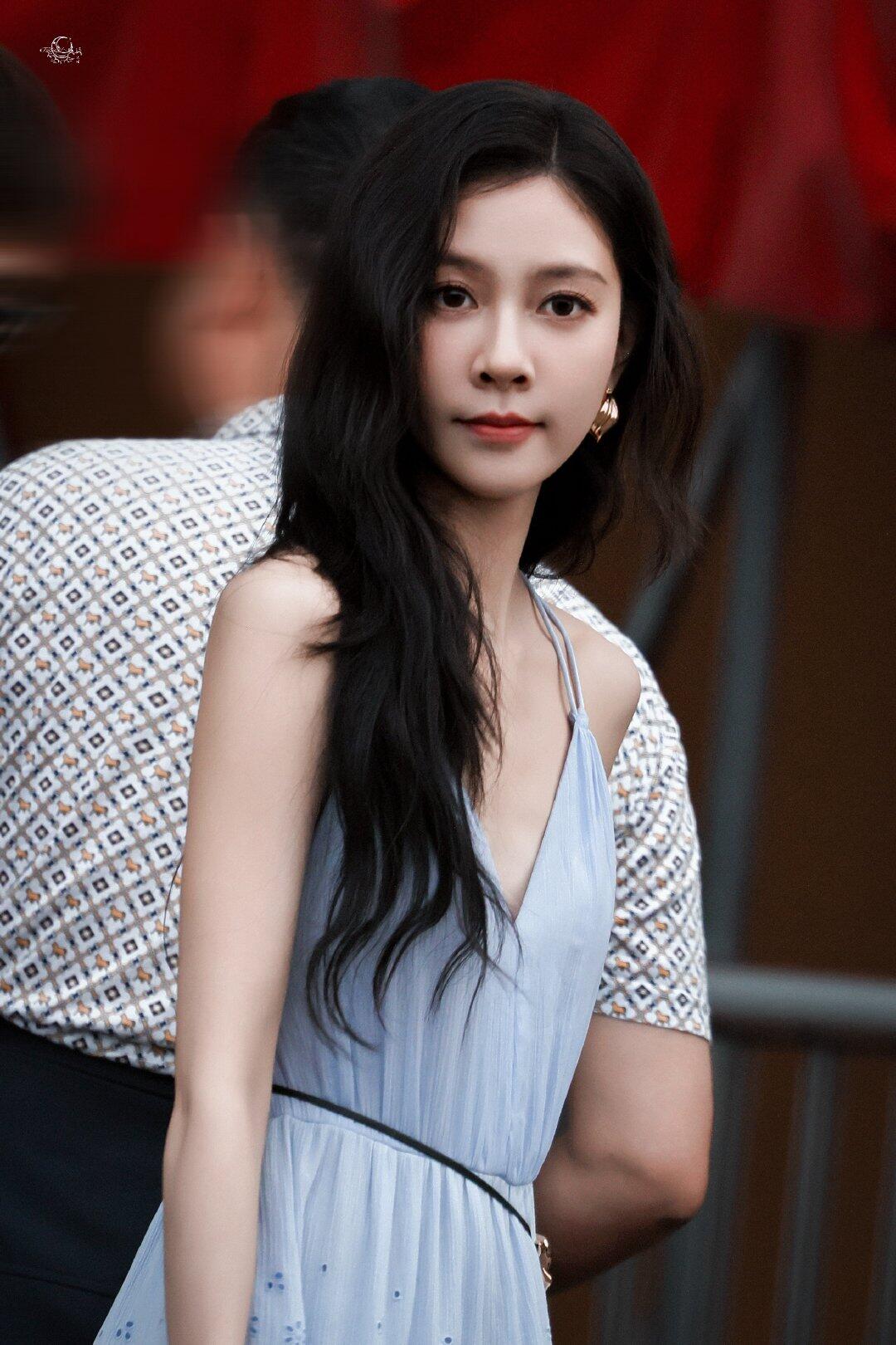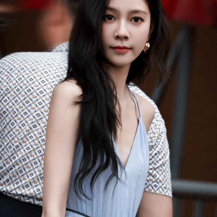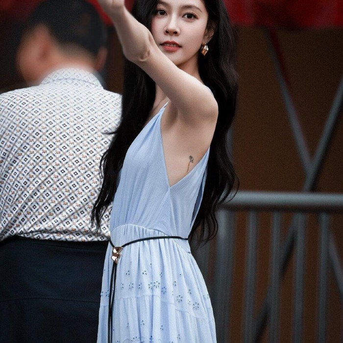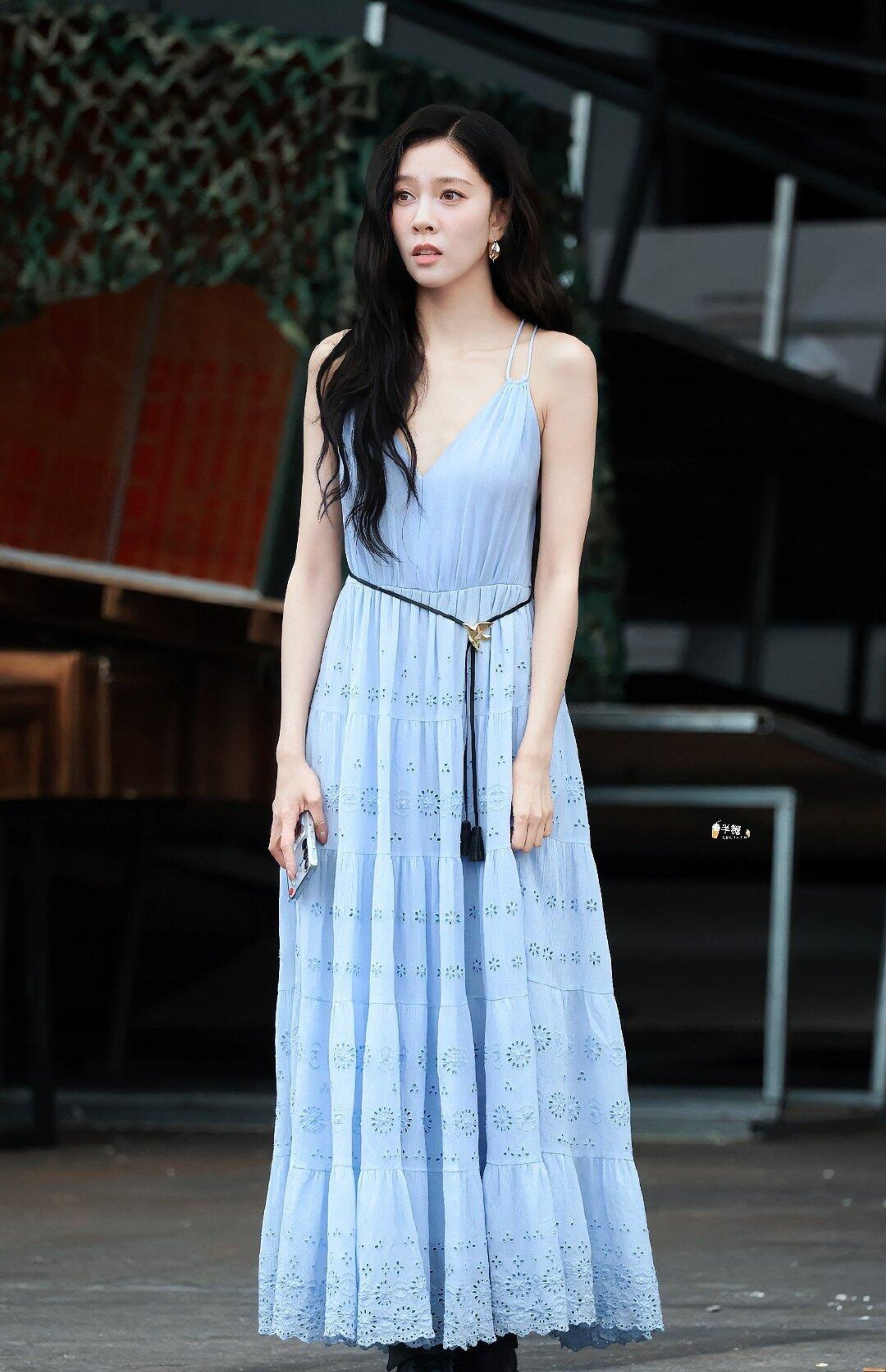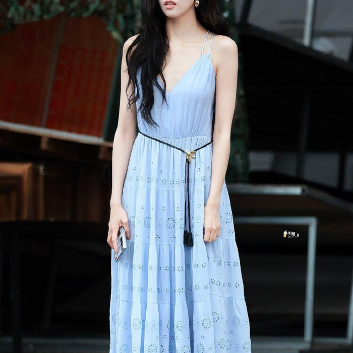 宋妍霏同款法式鏤空刺綉氣質吊帶連衣裙女夏藍色顯瘦V領禮服長裙