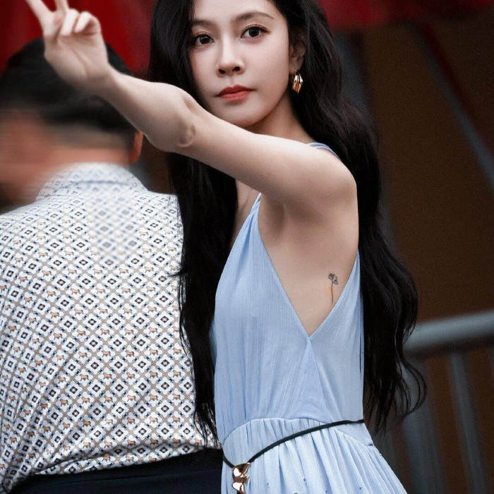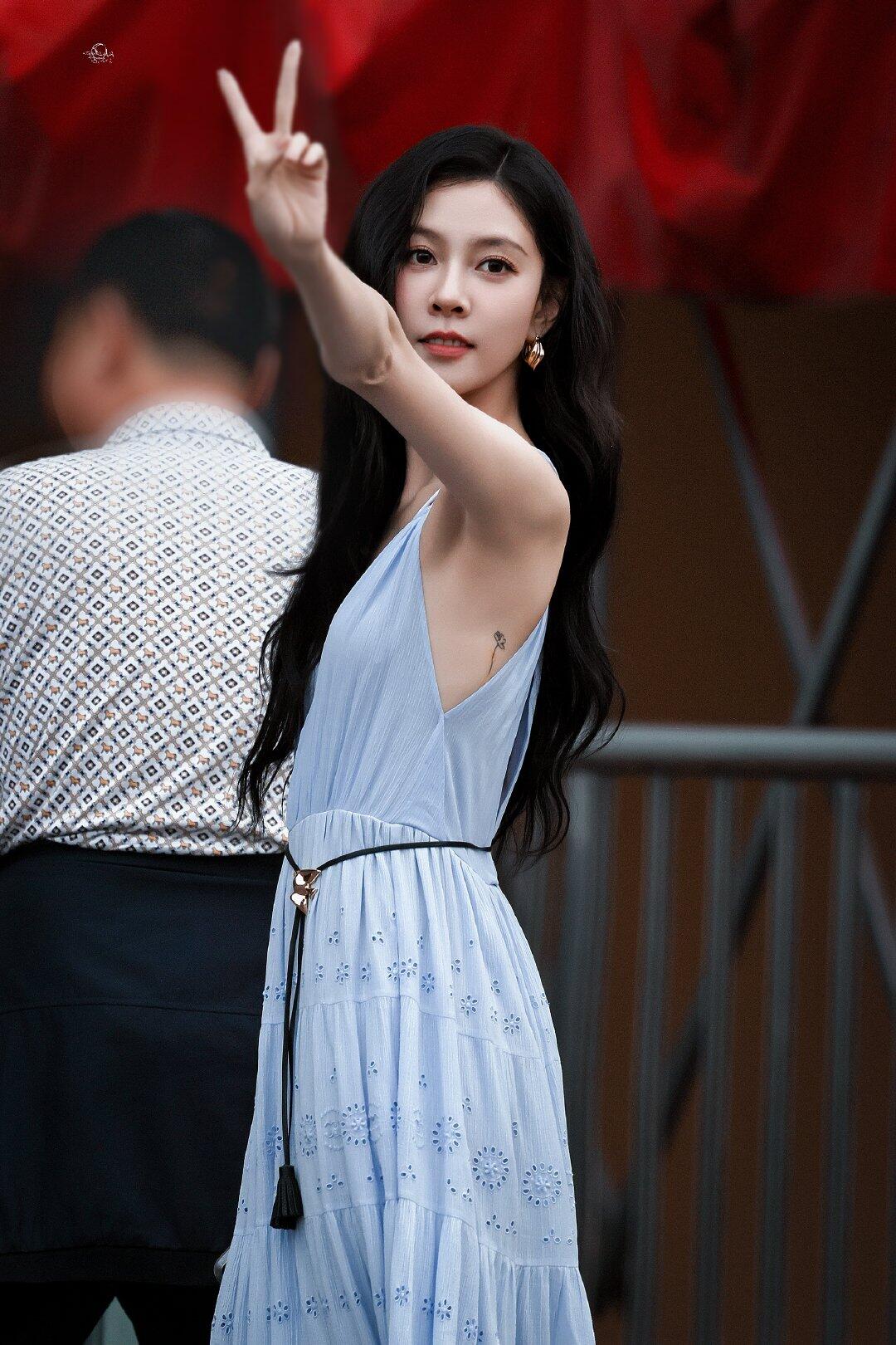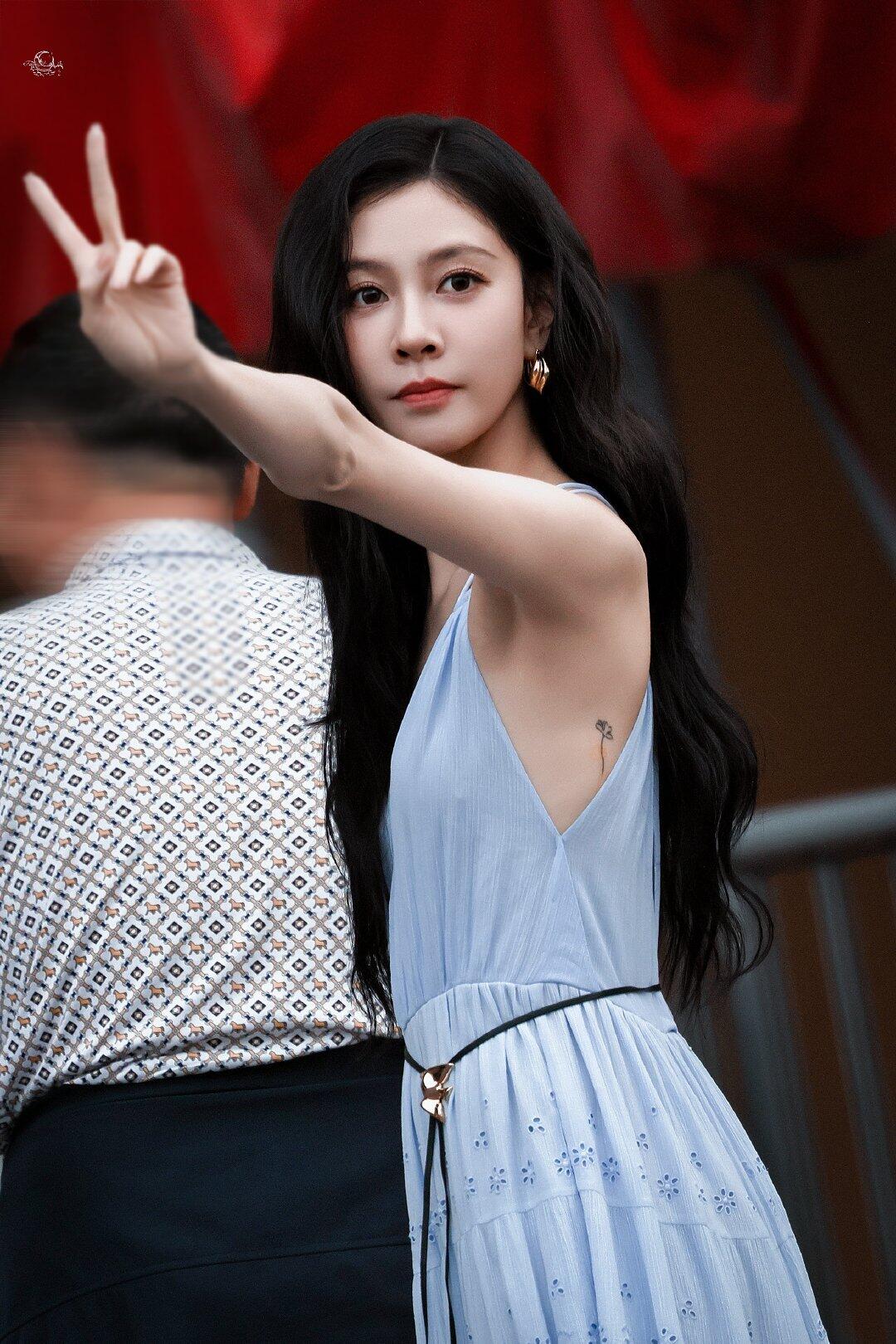 宋妍霏同款法式鏤空刺綉氣質吊帶連衣裙女夏藍色顯瘦V領禮服長裙