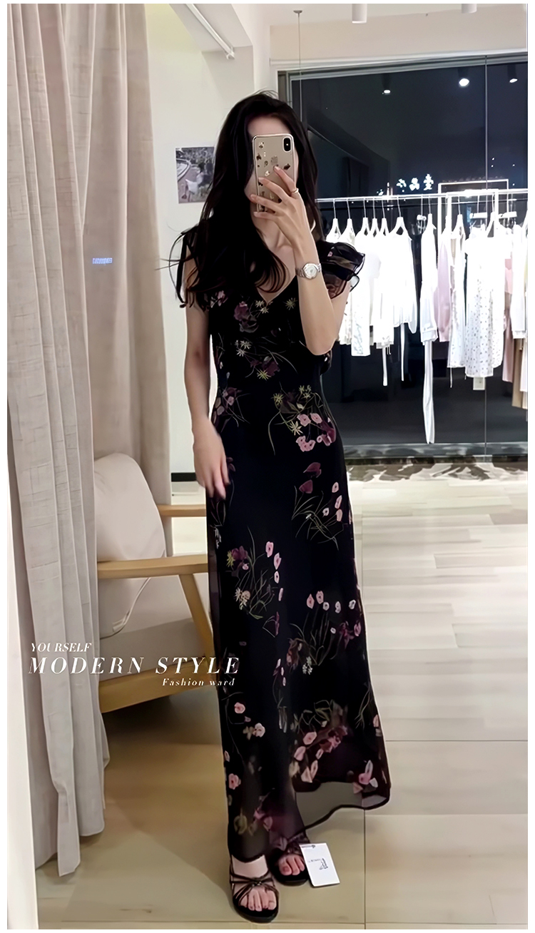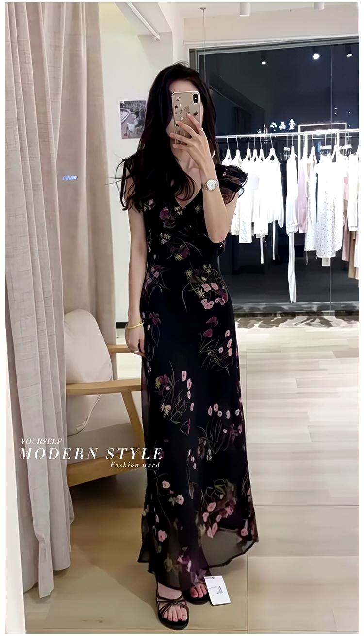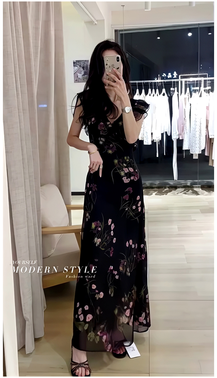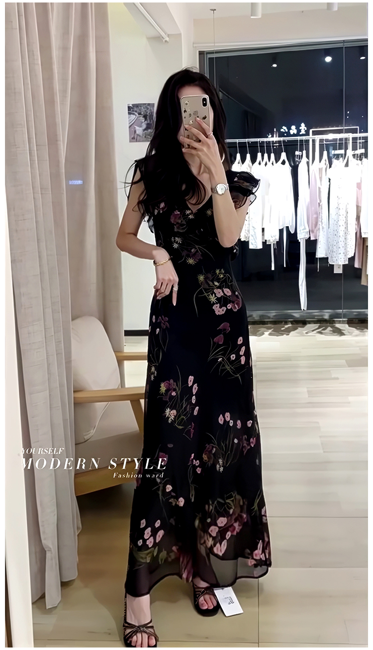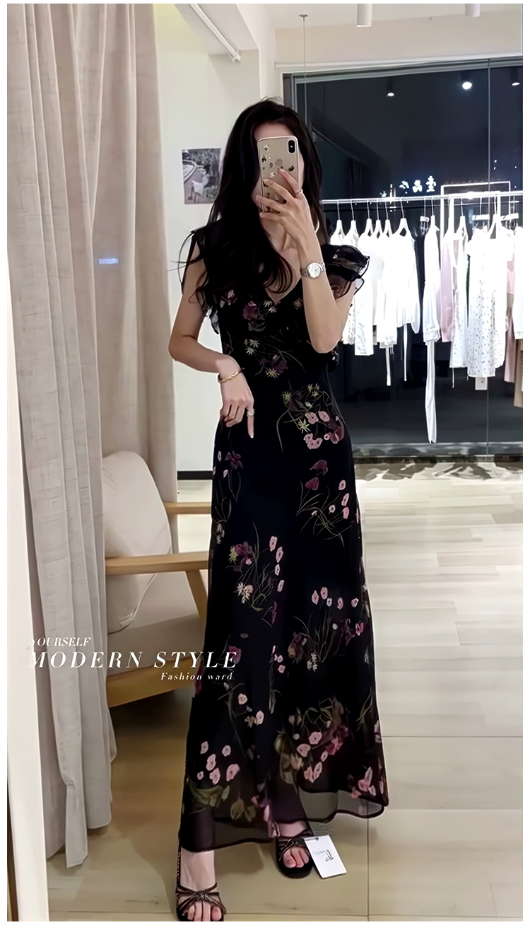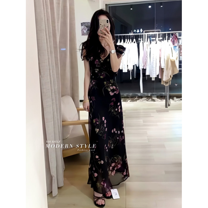 小個子顯高~黑色雪紡連衣裙小飛袖碎花長裙子垂感修身顯瘦2025ins