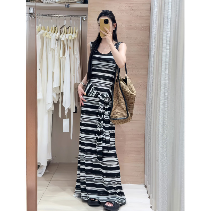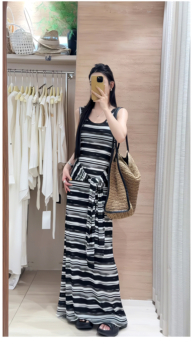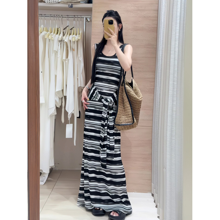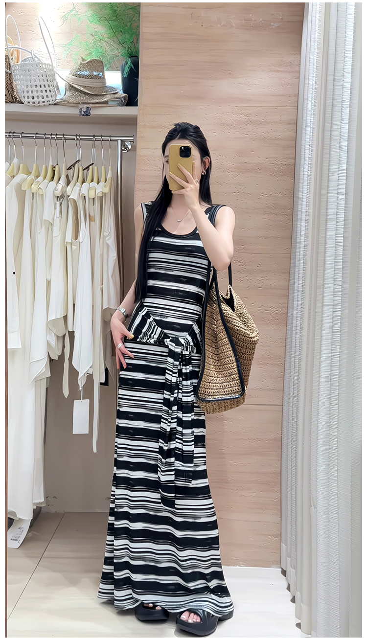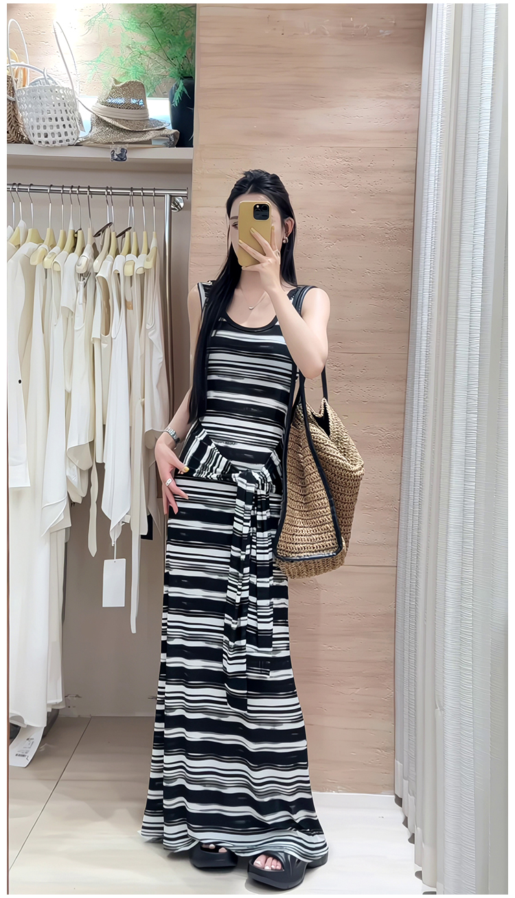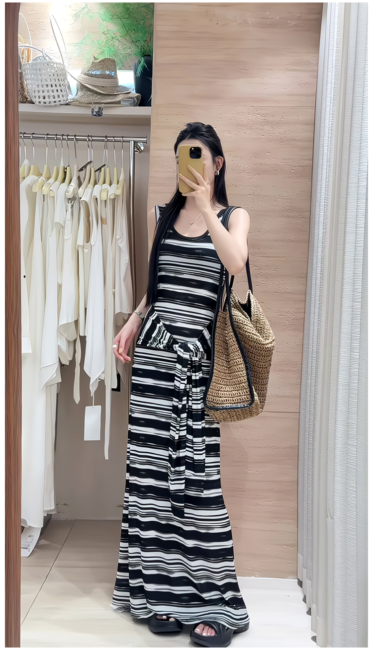 松弛美式*假兩件條紋綁帶背心裙黑白撞色長款度假連衣裙夏季新款