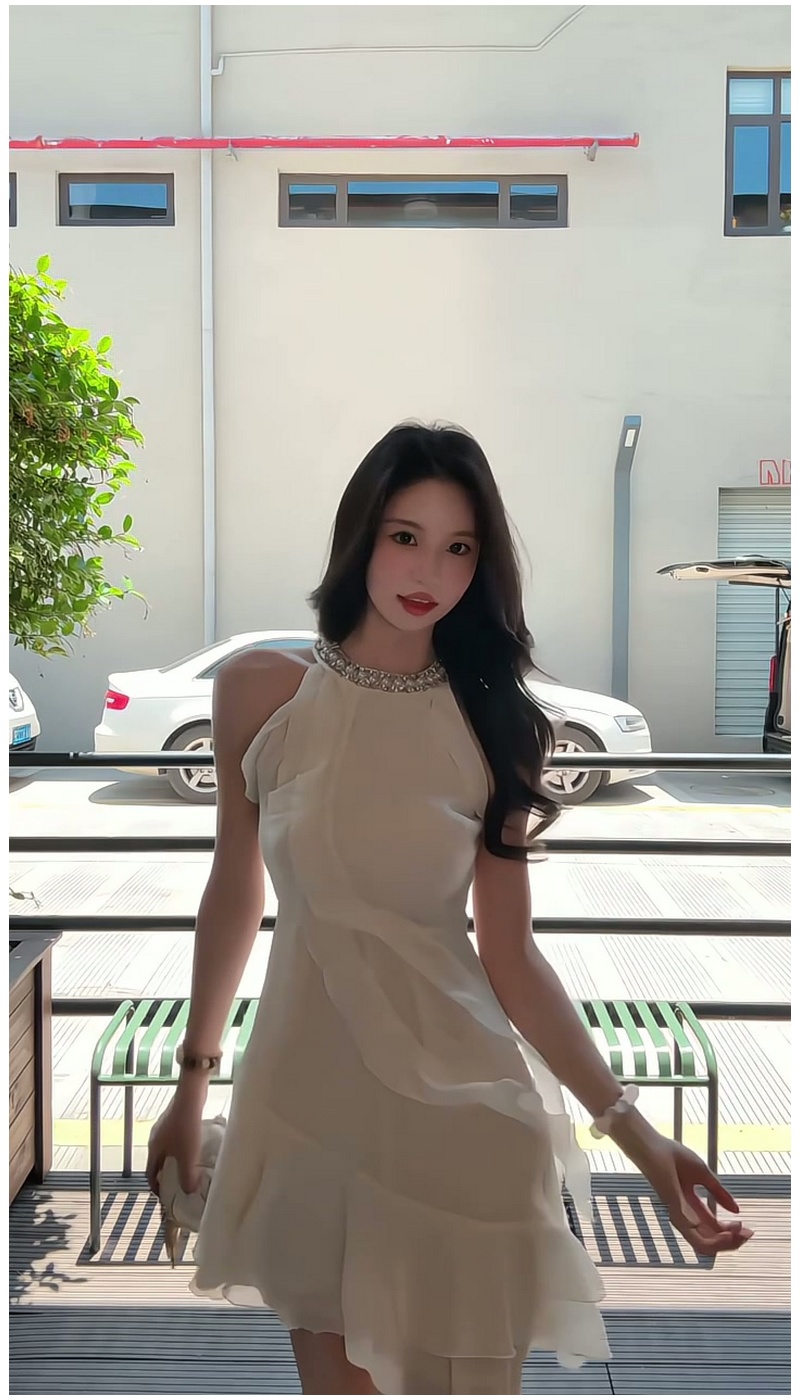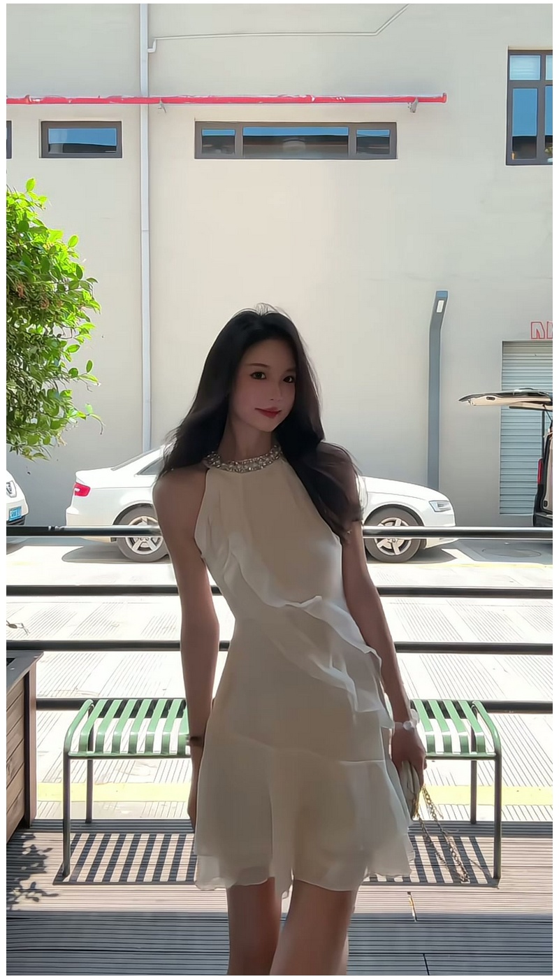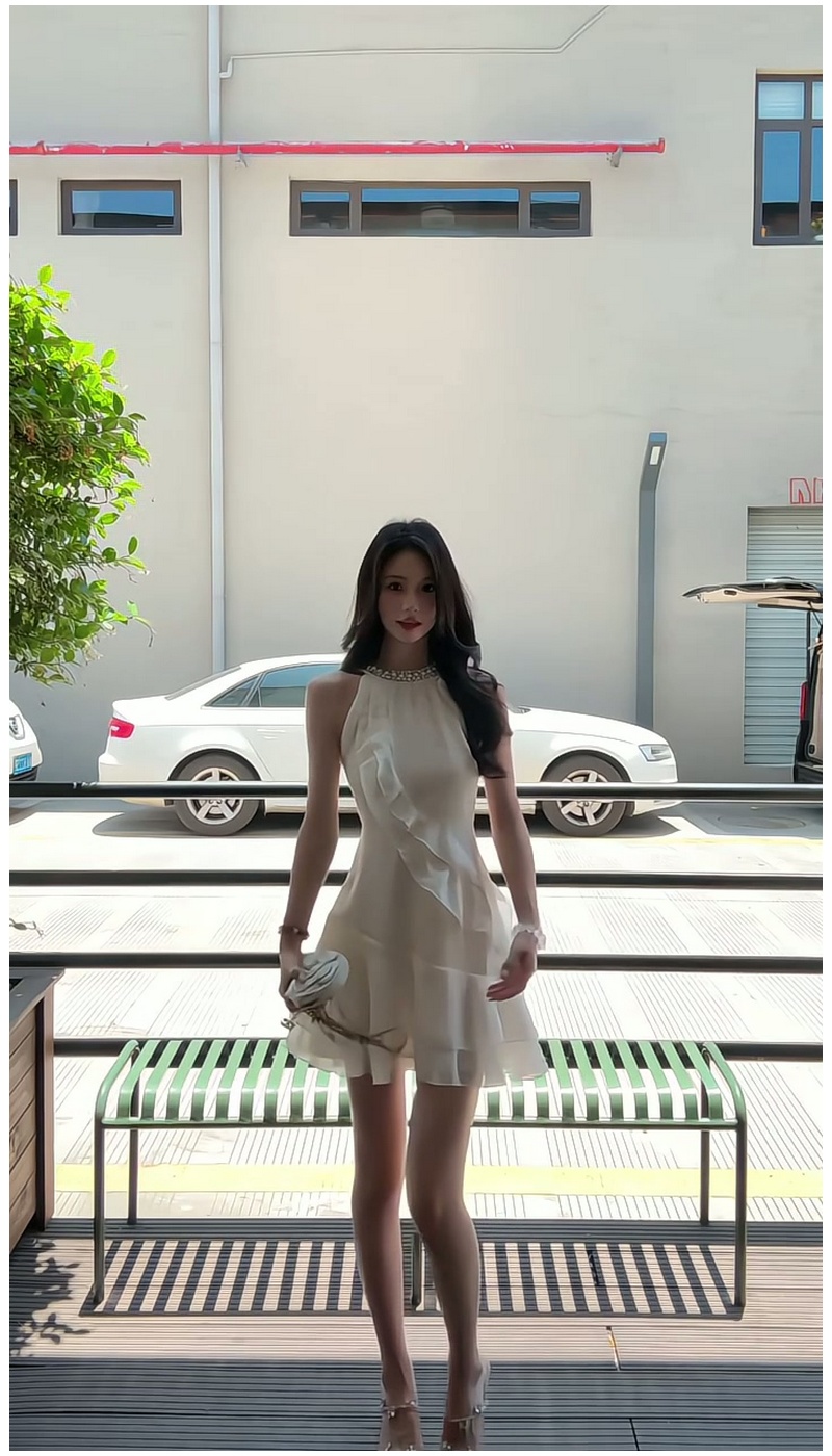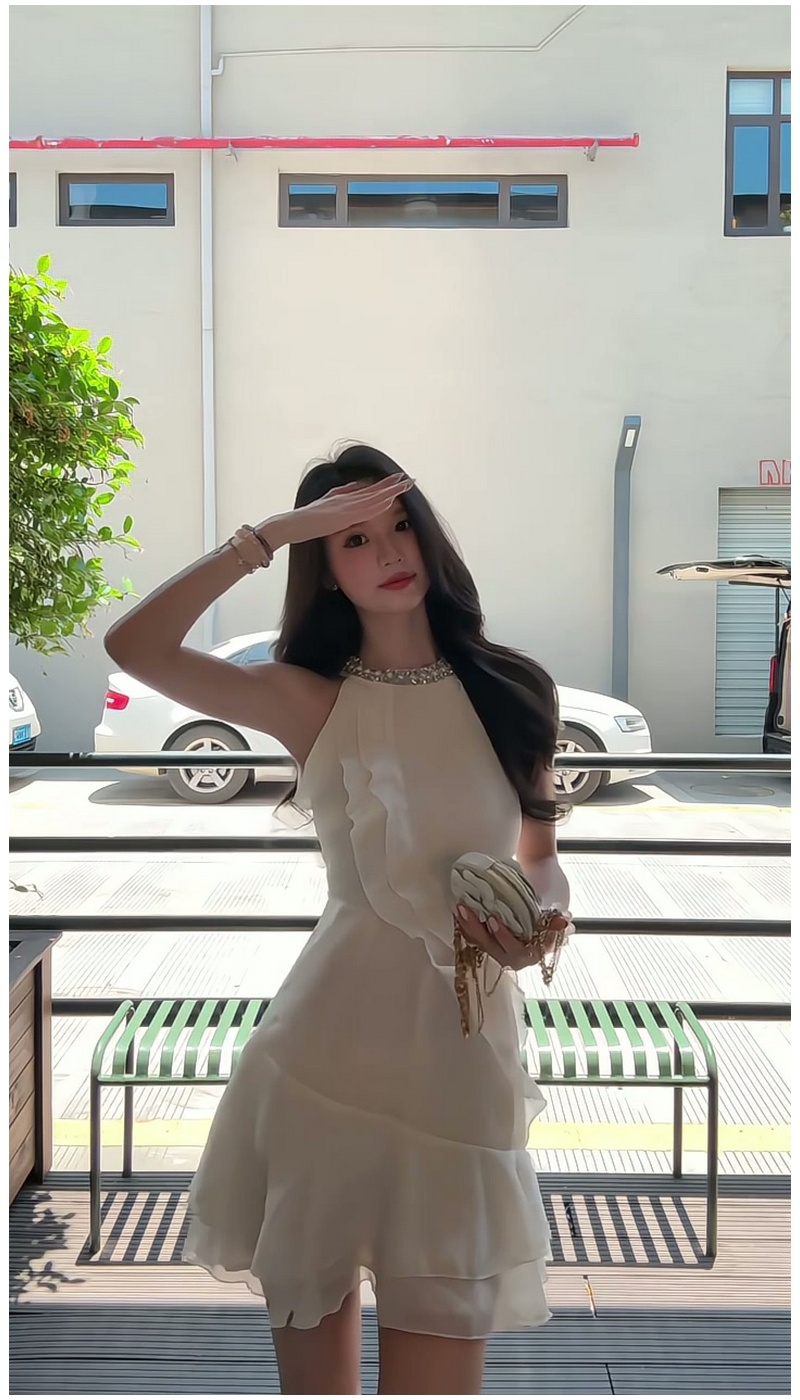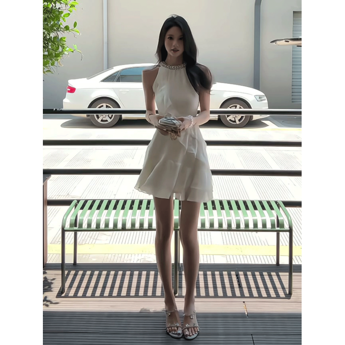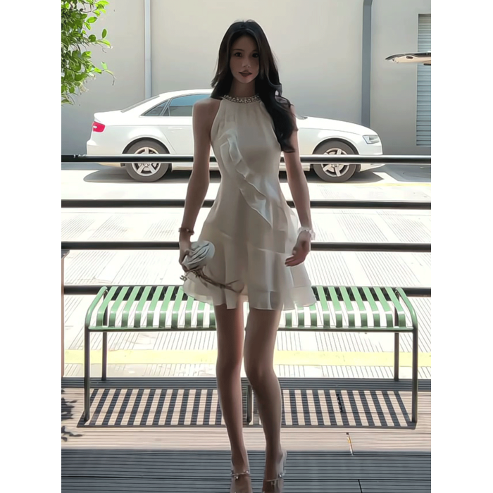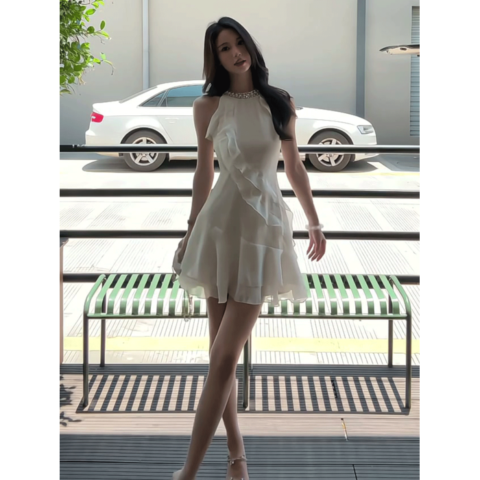 法式荷葉邊掛脖純欲性感連衣裙女夏季小個子甜美氣質收腰雪紡短裙