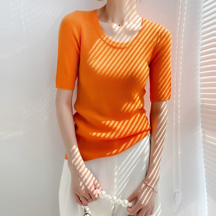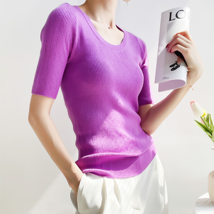 美麗減齡亮色低圓領套頭針織衫女夏季新款簡約百搭純色短袖打底衫