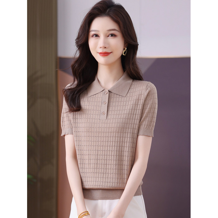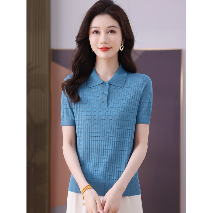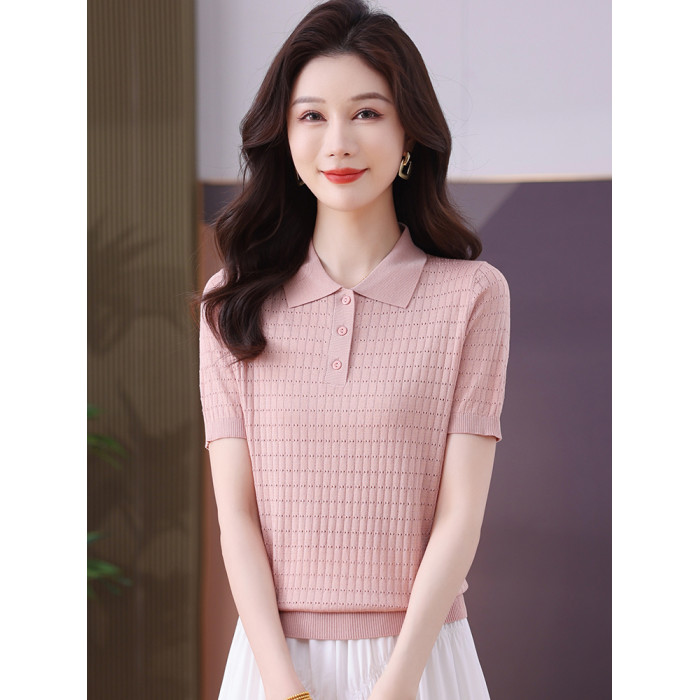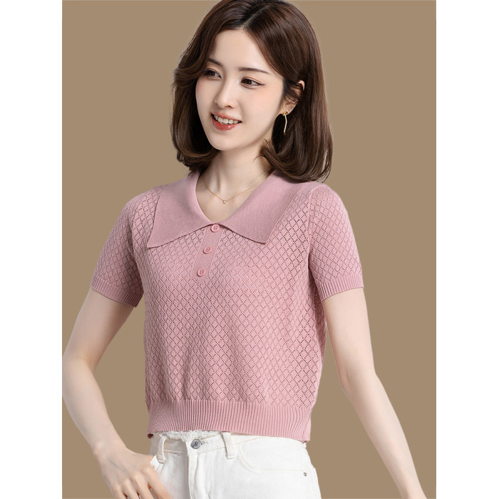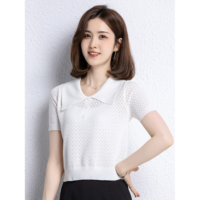 冰絲針織衫女夏季短款修身薄款鏤空短袖上衣洋氣桑蠶絲高腰打底衫