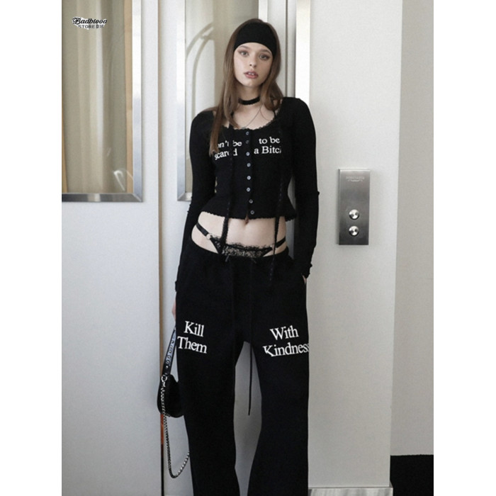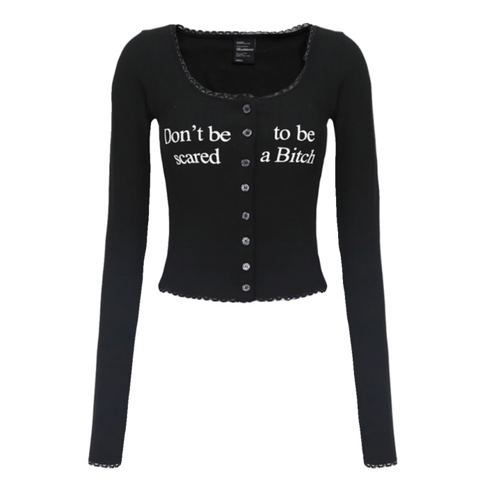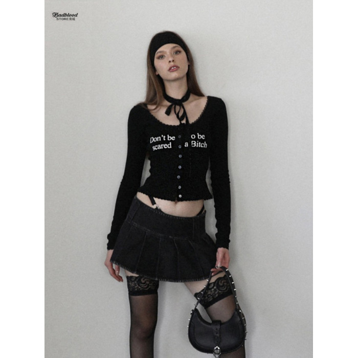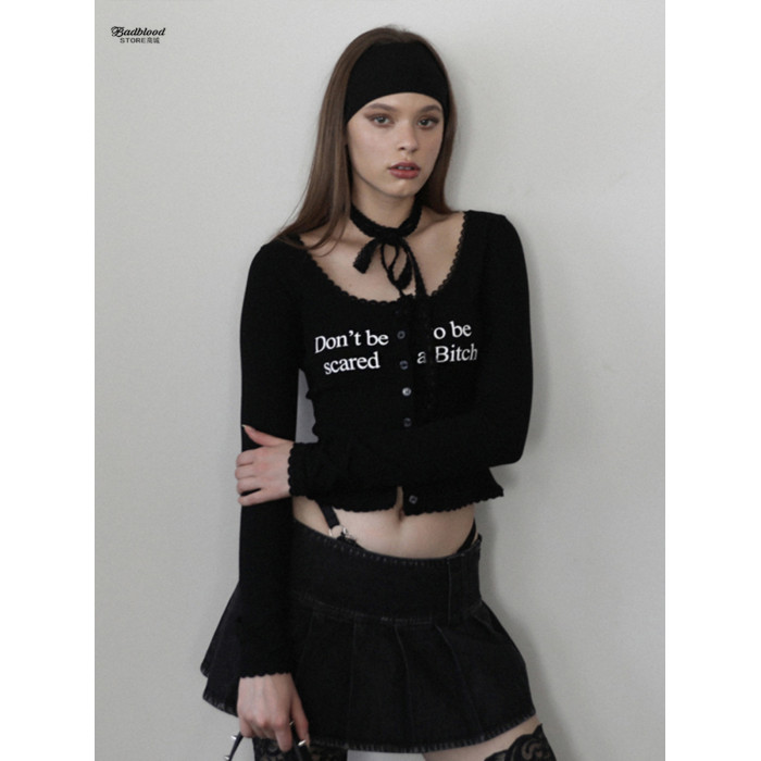 badblood紐釦打底衫女修身短款純欲風蕾絲邊性感辣妹長袖針織上衣