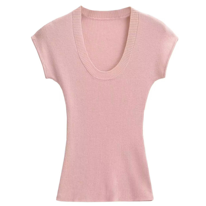 歐美風復古時髦純色柔軟輕薄內搭彈力修身U領針織短袖T打底衫上衣