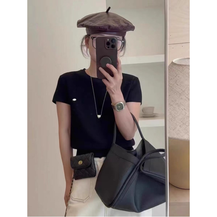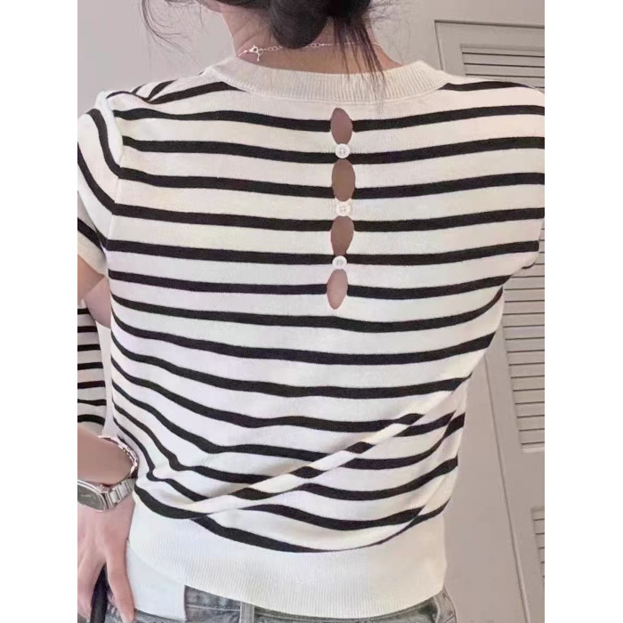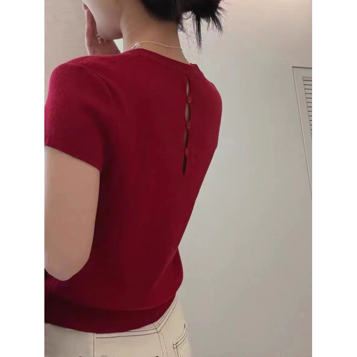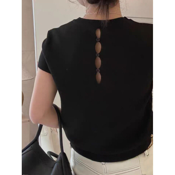 2025年秋季後背鏤空正肩短袖小衆設計感修身短款針織打底衫上衣女