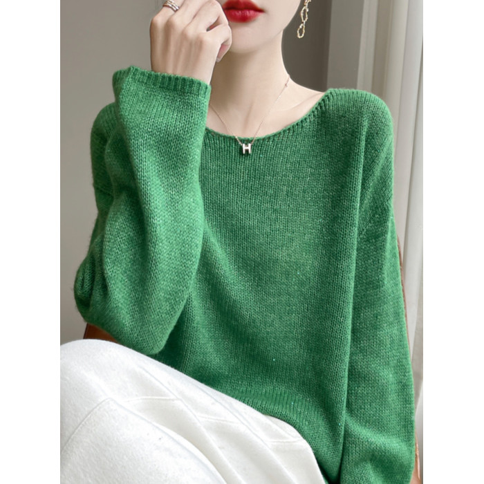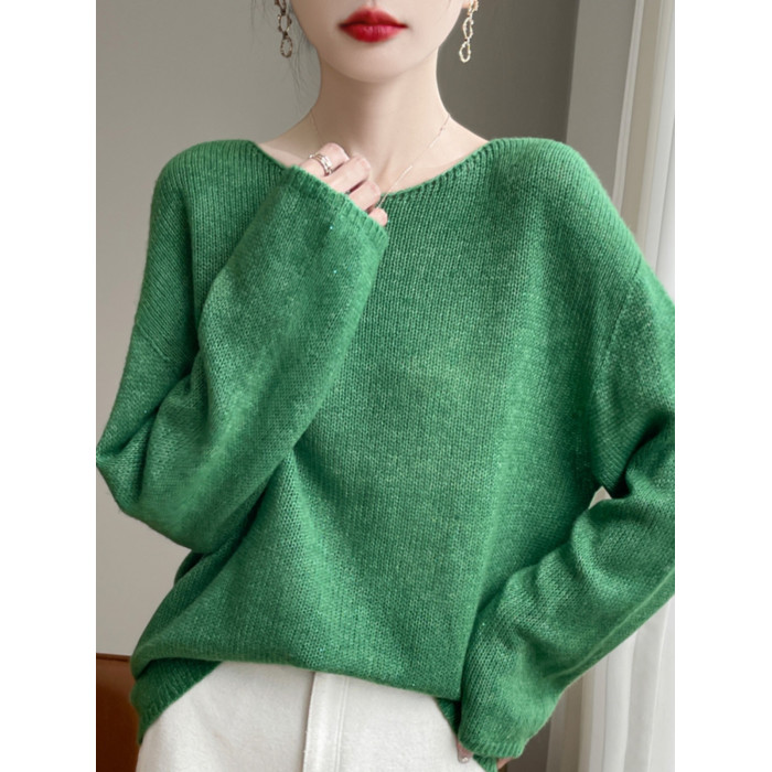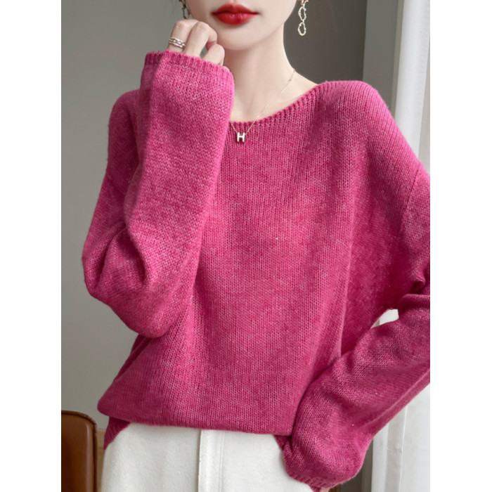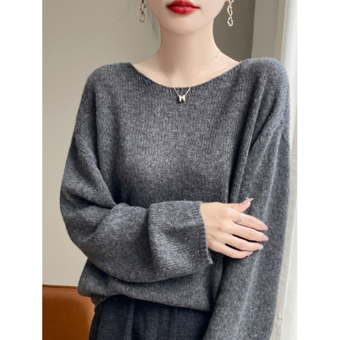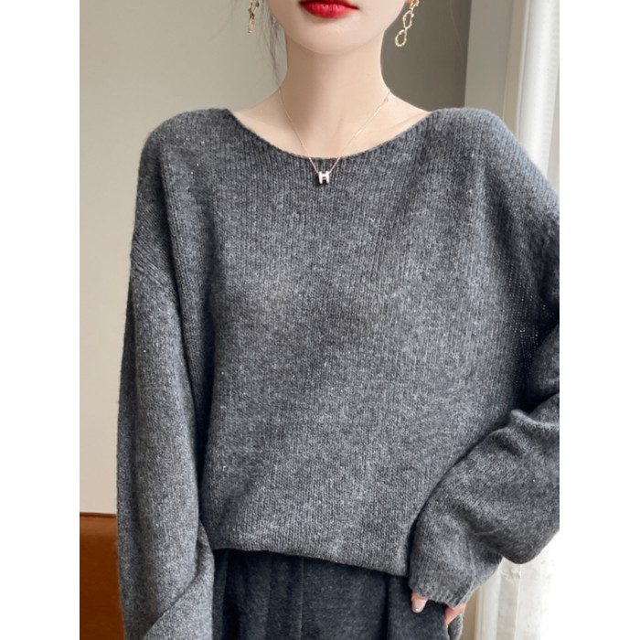 2024秋冬新款桑蠶絲加山羊絨衫女一字領毛衣女慵懶純色針織打底衫