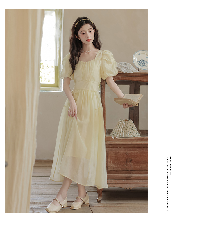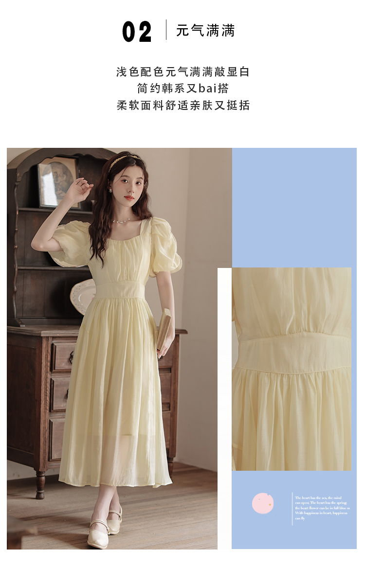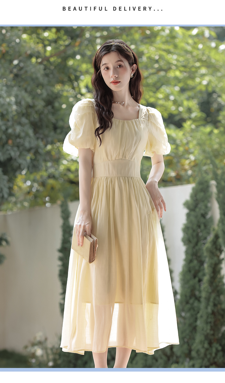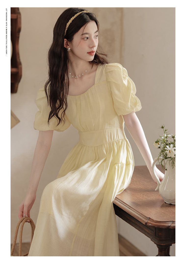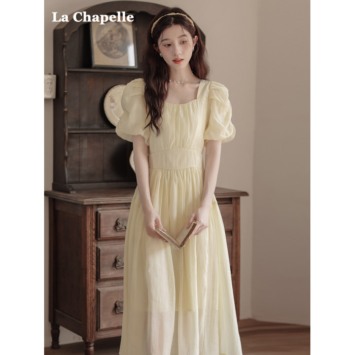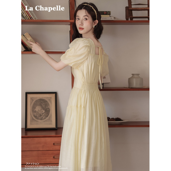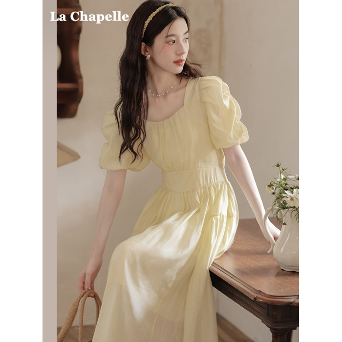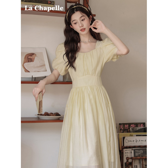 拉夏貝爾官方法式茶歇連衣裙女2025夏季新款甜美顯瘦氣質黃色長裙