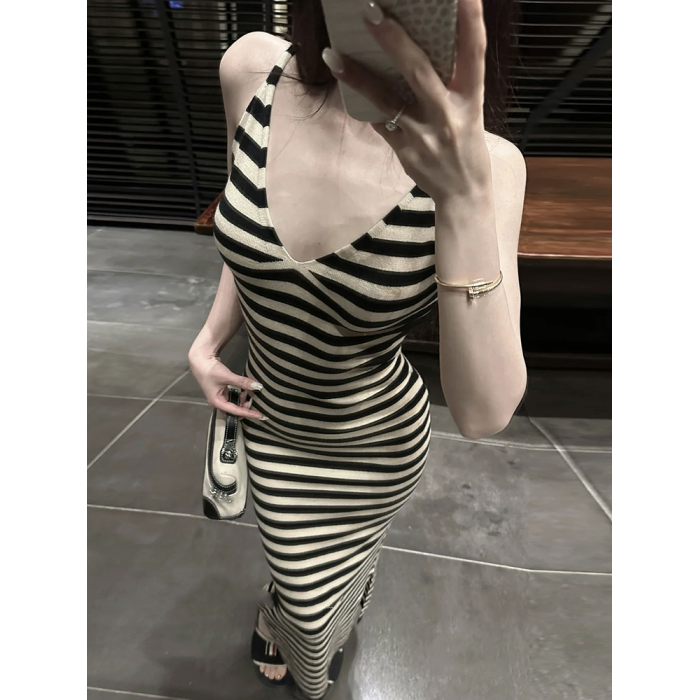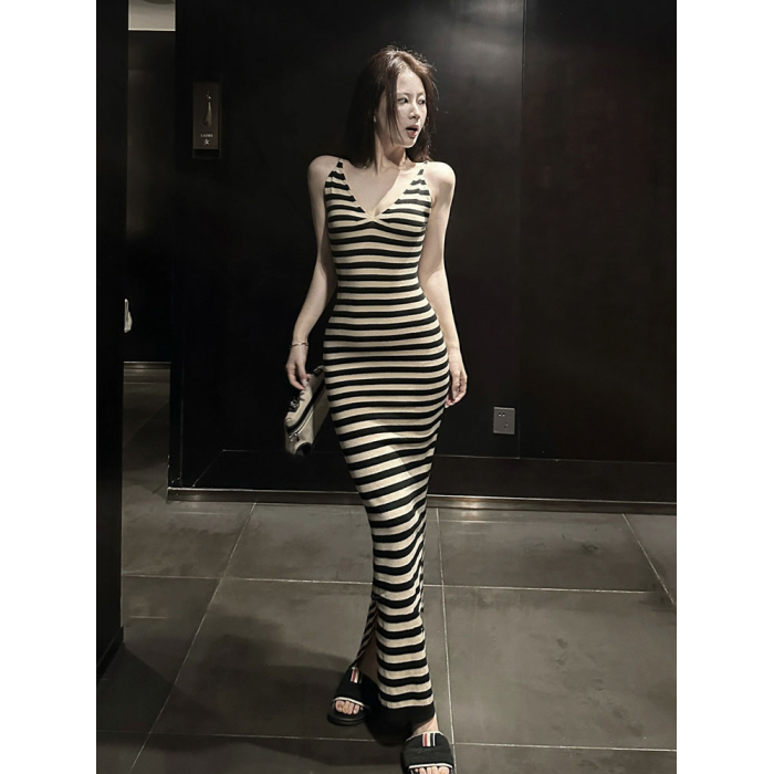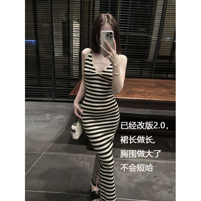 高個子172加長版夏季撞色條紋V領吊帶連衣裙氣質性感修身包臀長裙