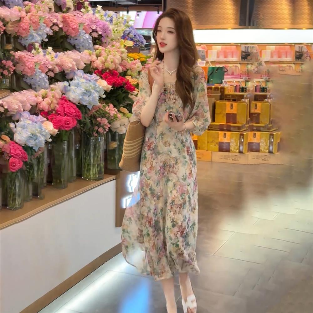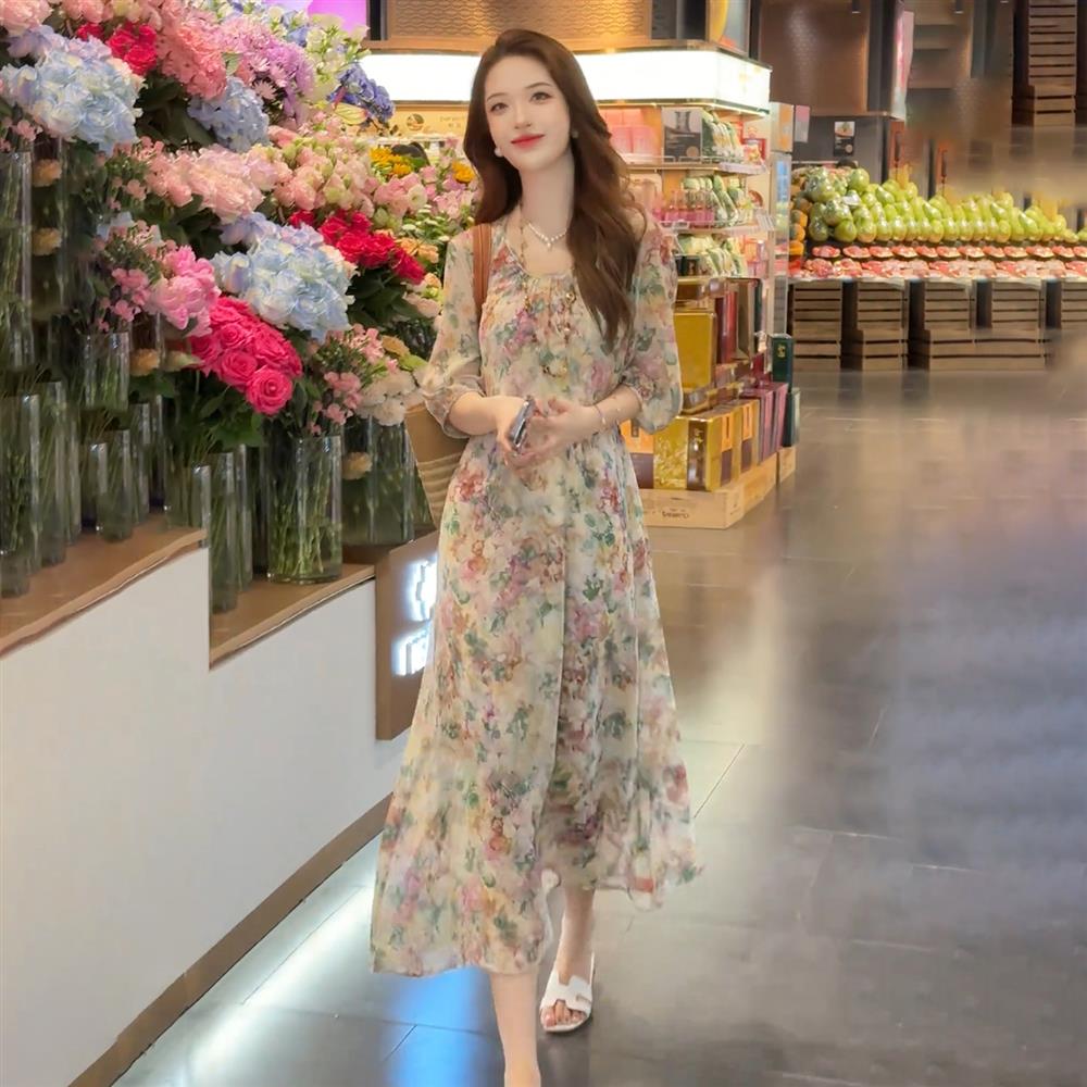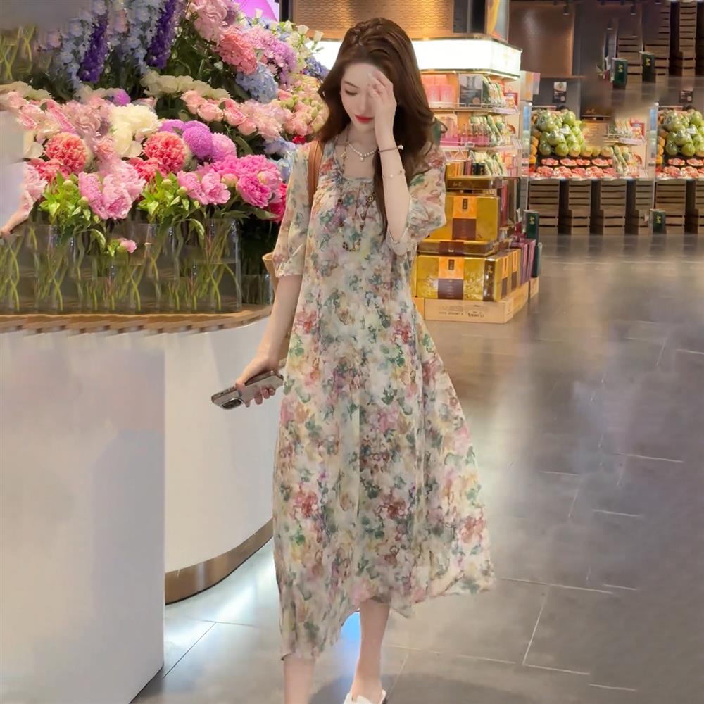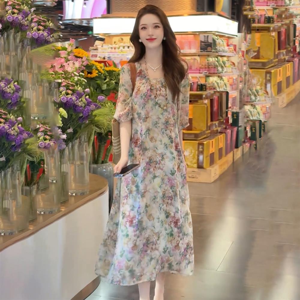 法式雪紡印花圓領連衣裙女2025夏裝輕奢洋氣寬松顯瘦中長款裙子潮