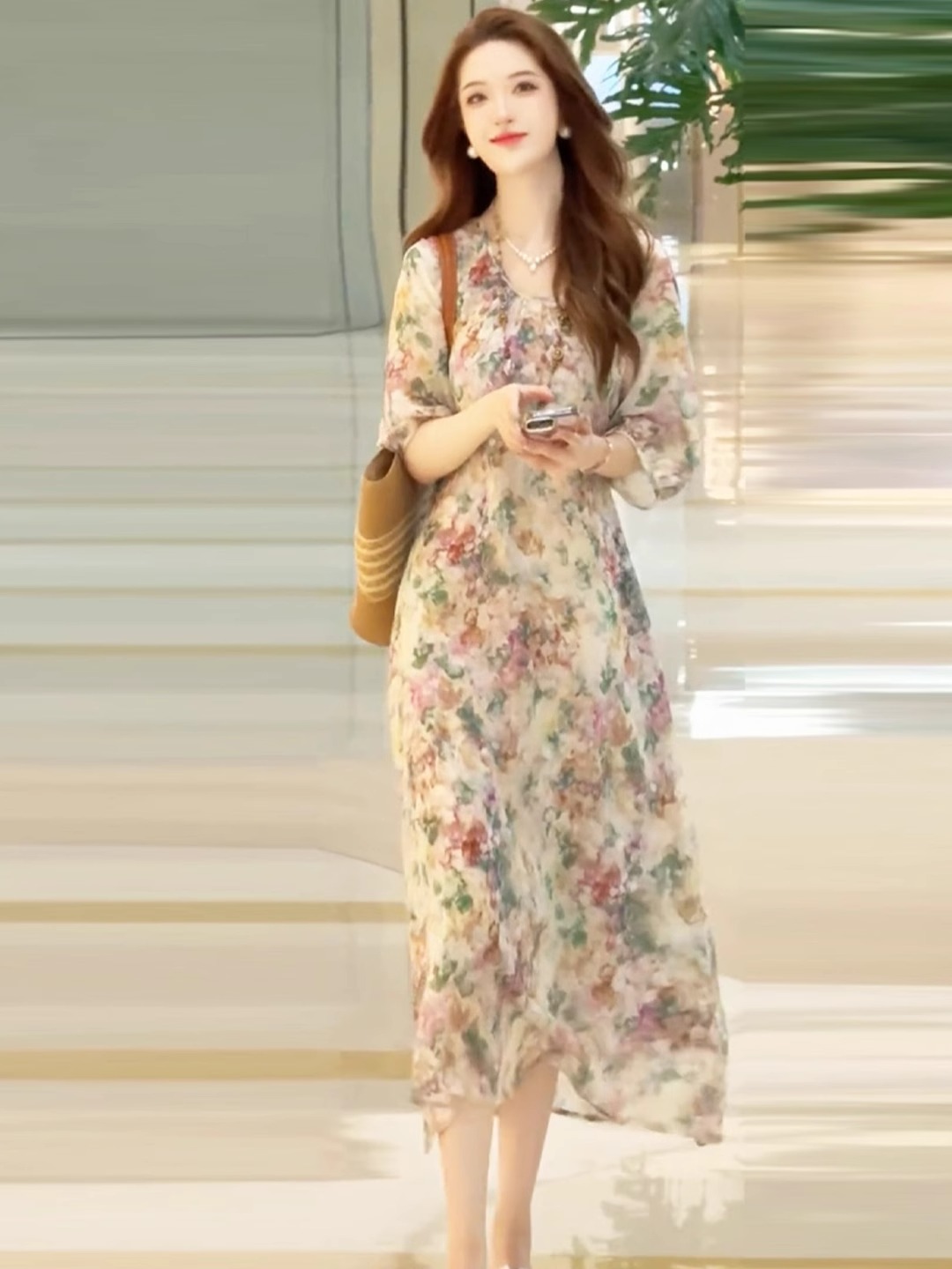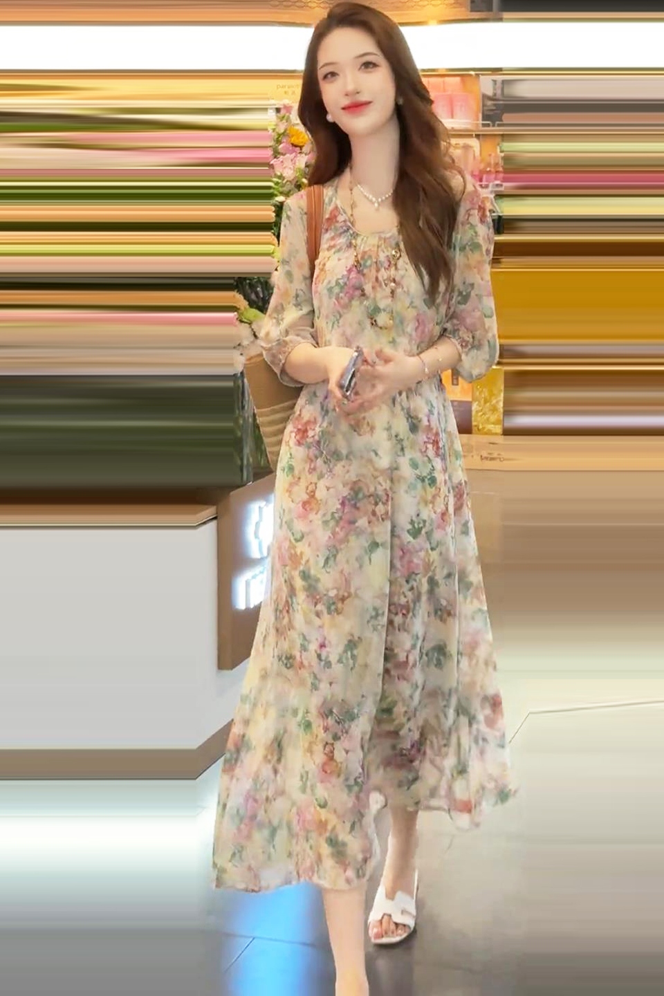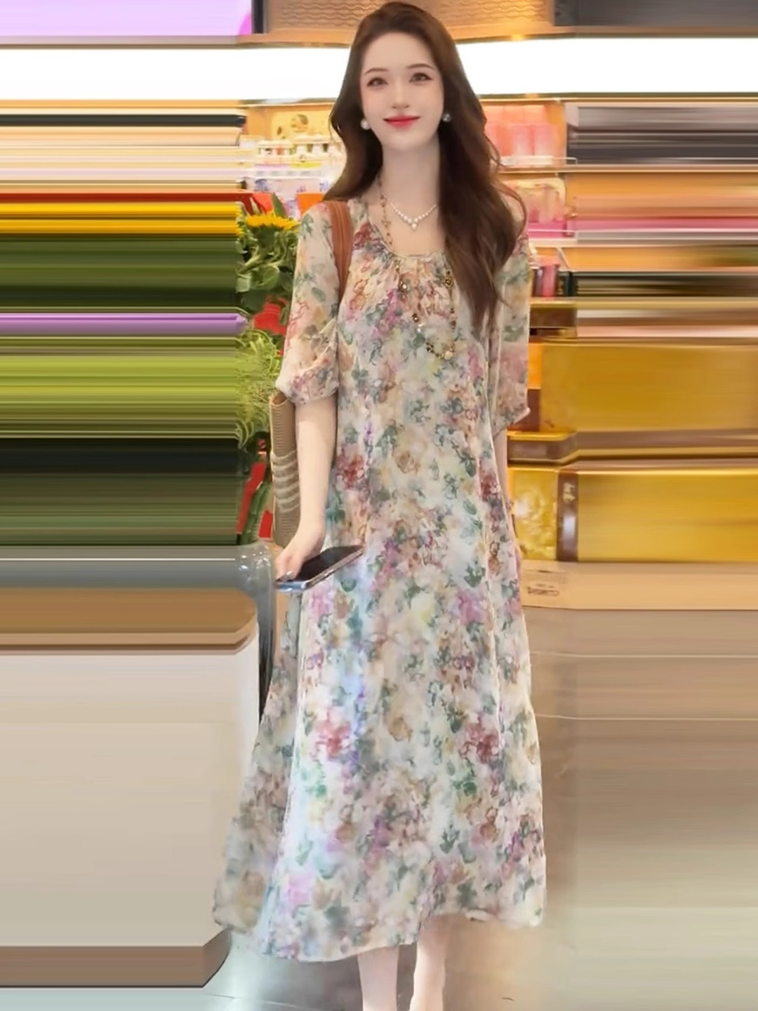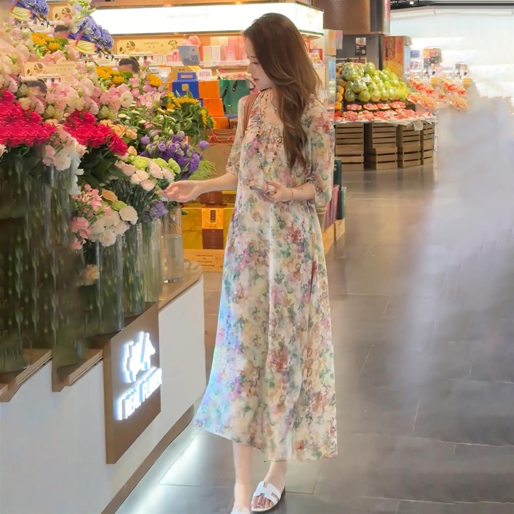 法式雪紡印花圓領連衣裙女2025夏裝輕奢洋氣寬松顯瘦中長款裙子潮