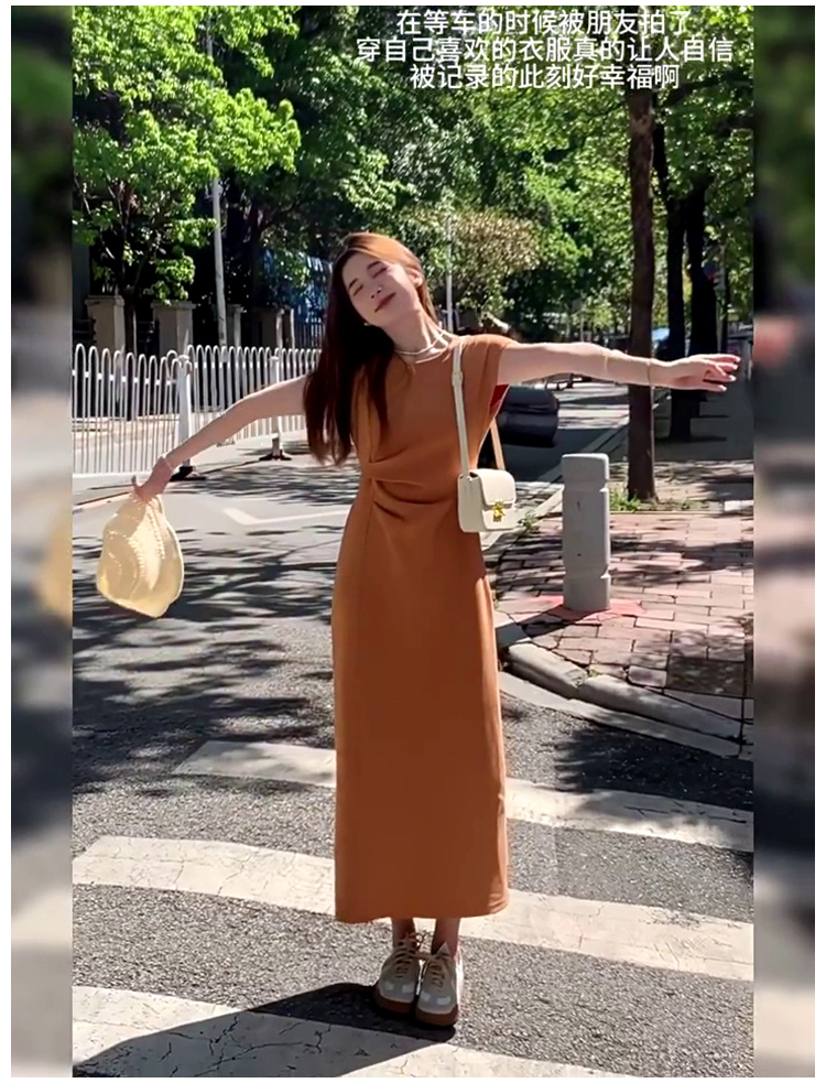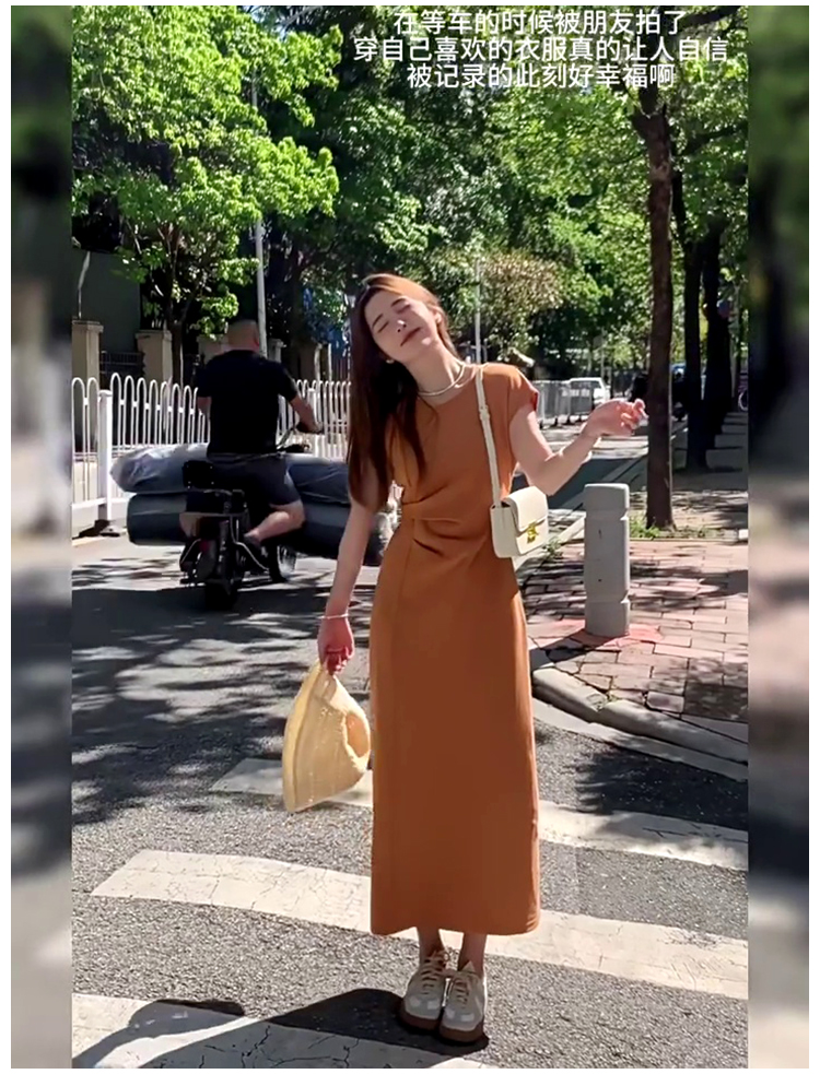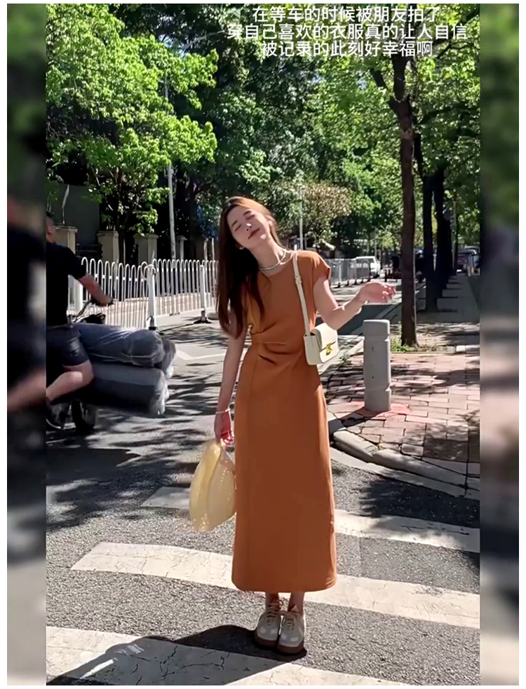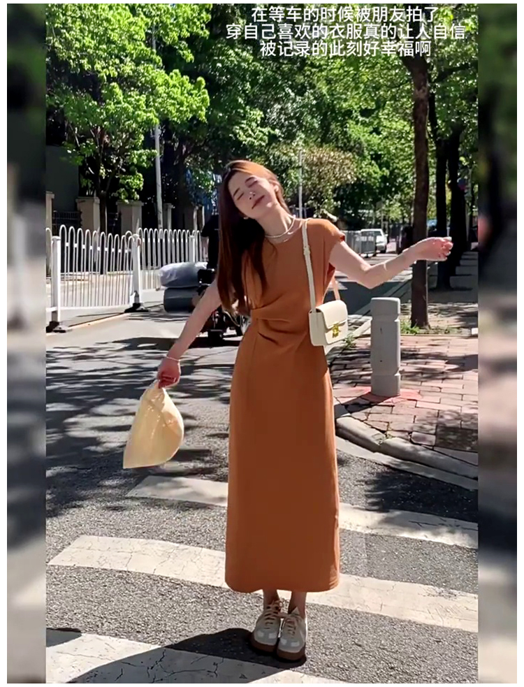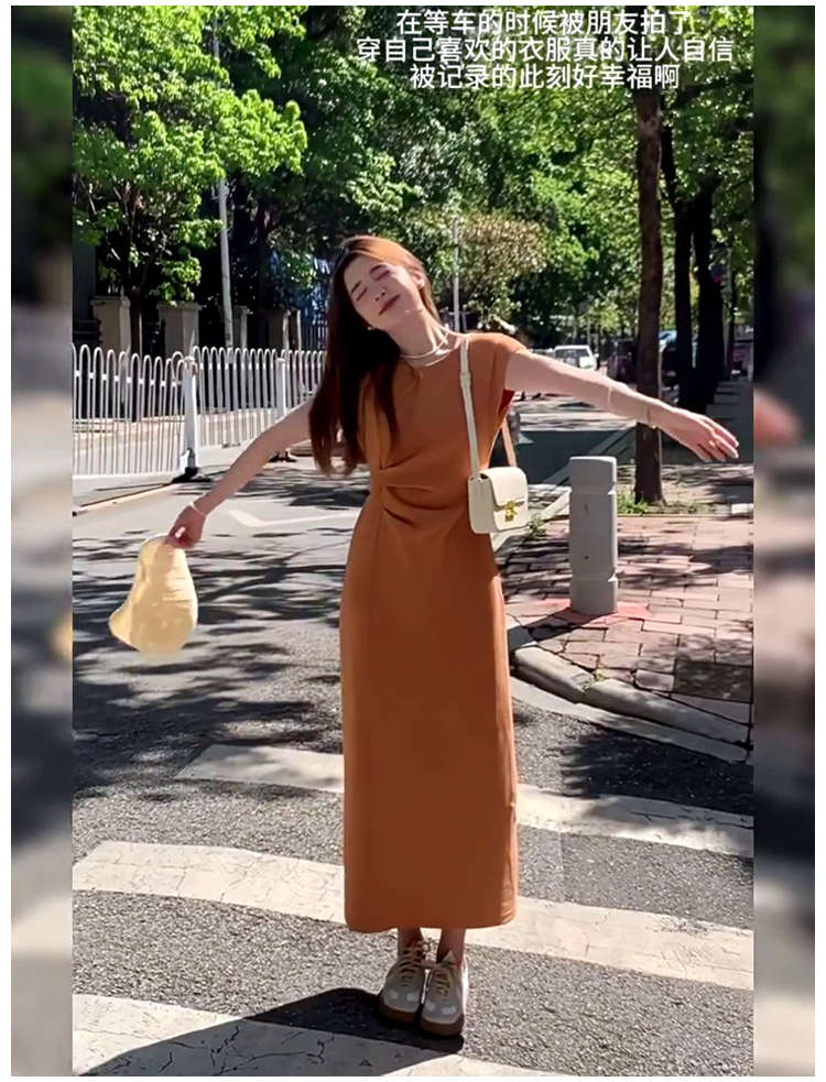 法式氣質t恤連衣裙女夏季2025新款高級感收腰顯瘦飛飛袖直筒長裙