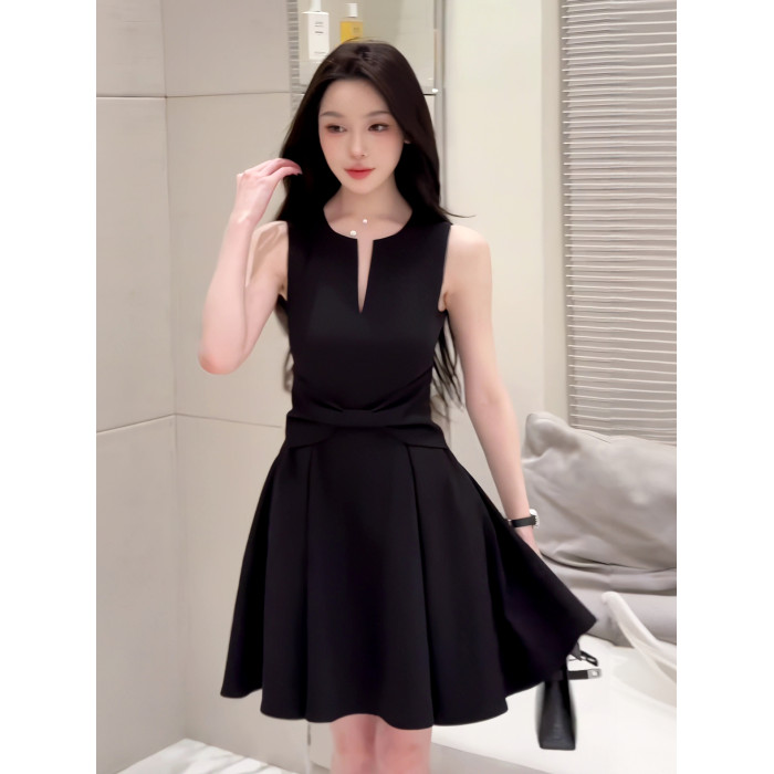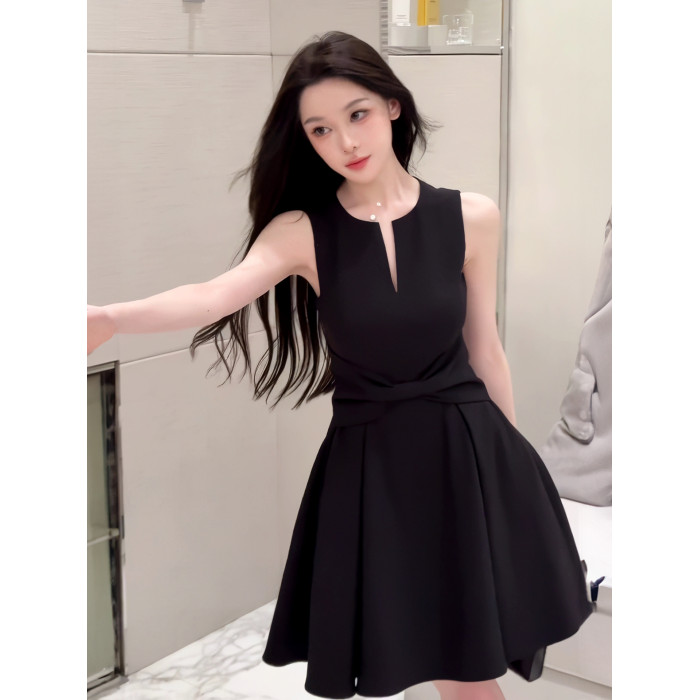 黑色V領無袖收腰連衣裙2025新款夏季女裝法式輕熟小衆不撞款裙子