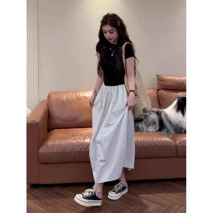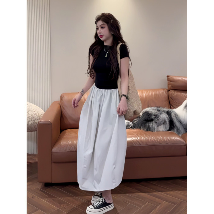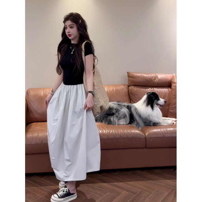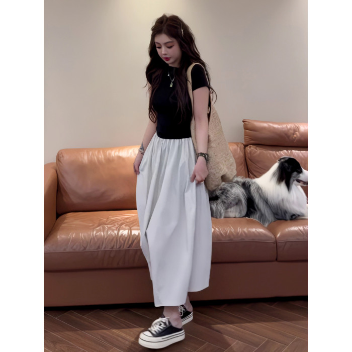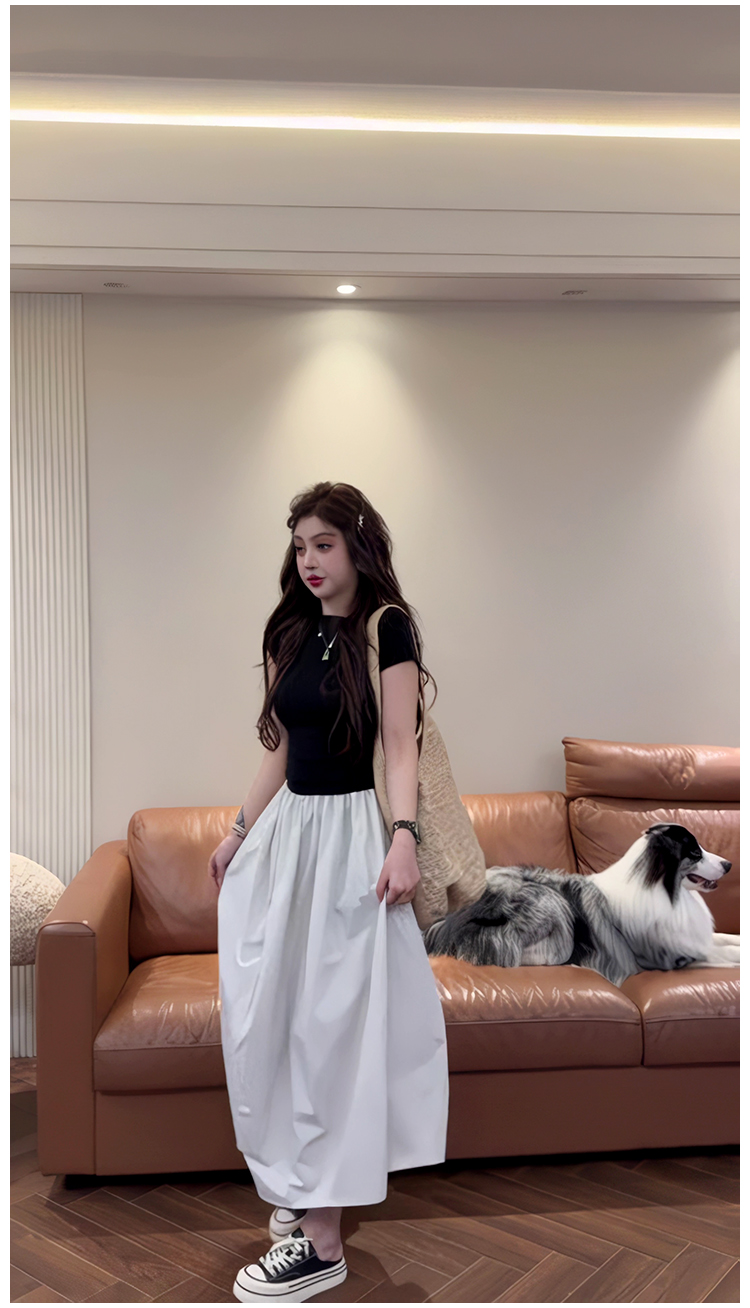 法式假兩件拼接短袖斜肩連衣裙女夏季2025新款今年流行爆款長裙子