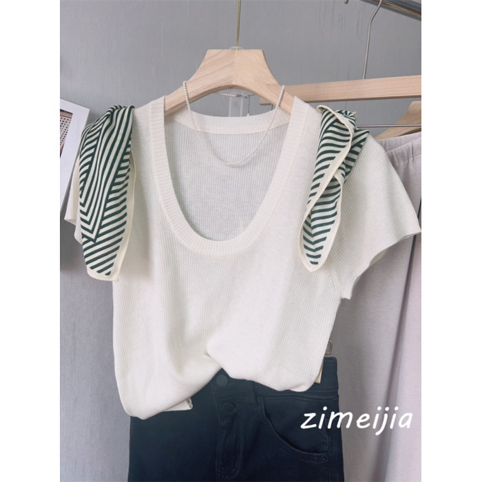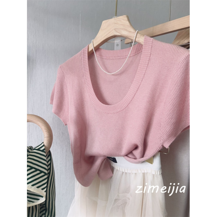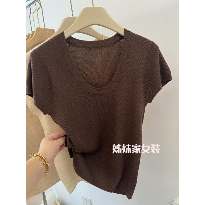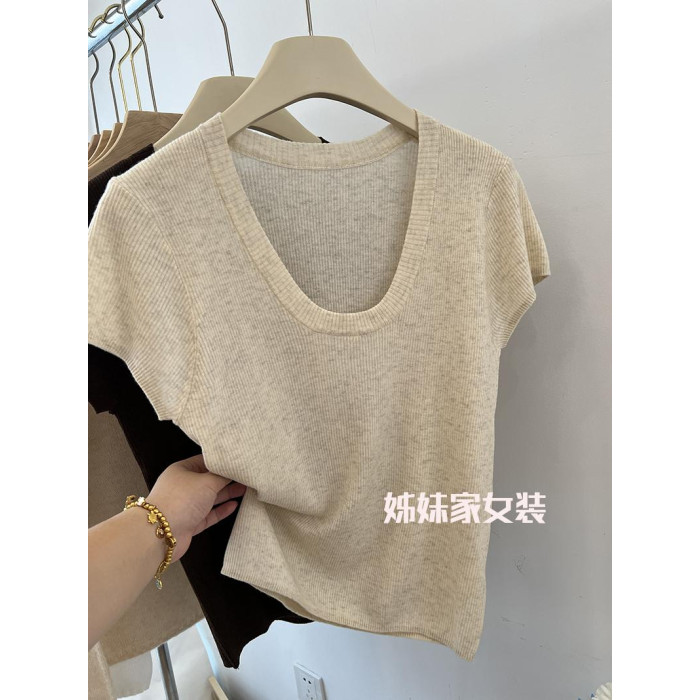 32.8%超細綿羊毛~~氣質U領全羊毛短袖上衣女打底衫修身顯瘦2025春