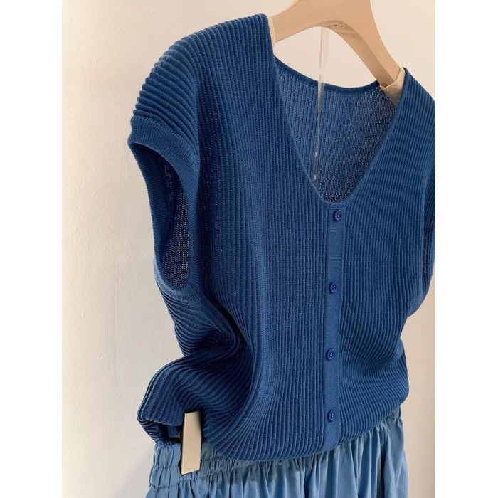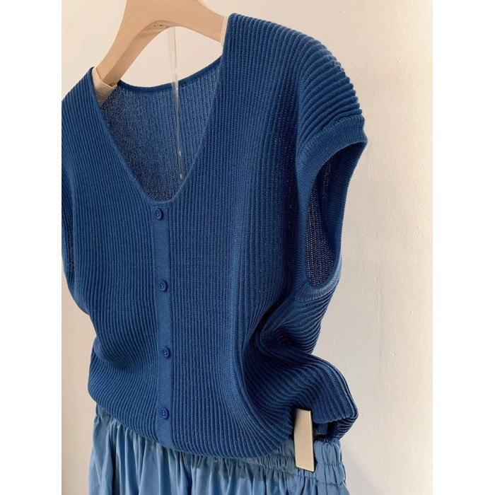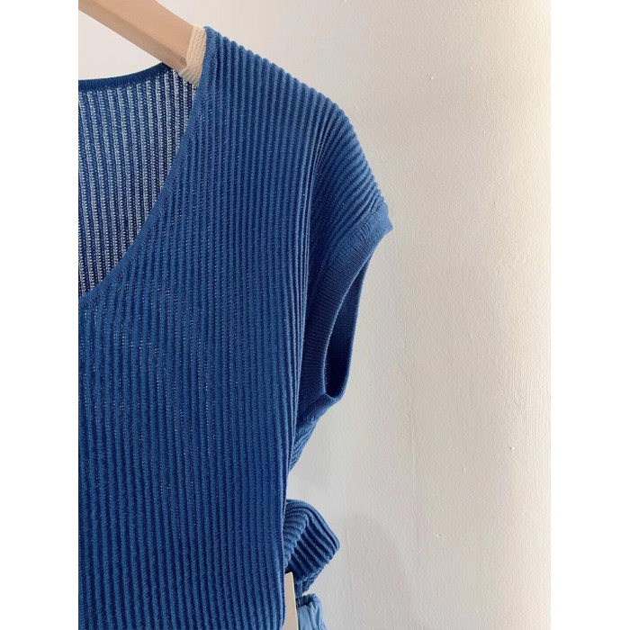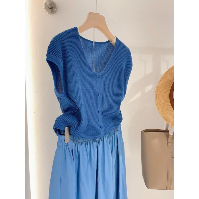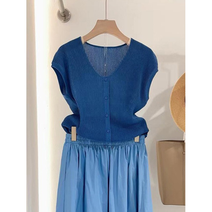 韓系藍色軟糯親膚飛飛袖針織衫女2025新款春秋大碼V領內搭打底衫