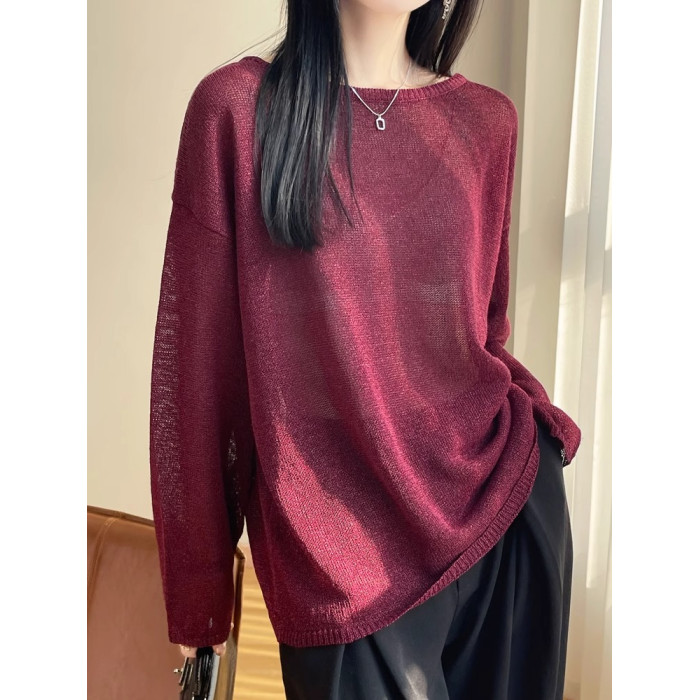一字領微透亞麻針織打底衫寬松慵懶風和紙紗高級感長袖罩衫防曬衫