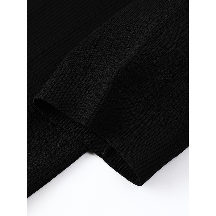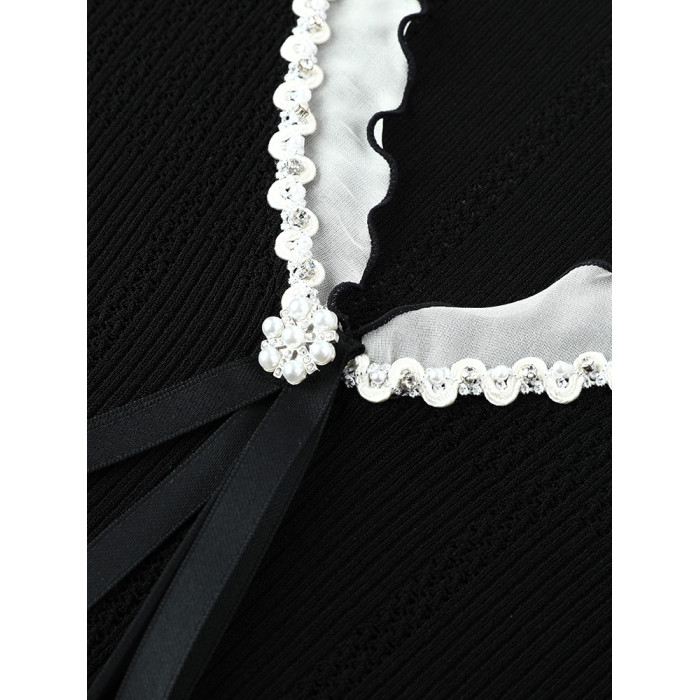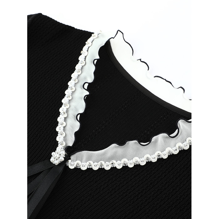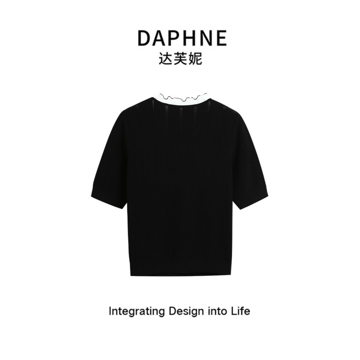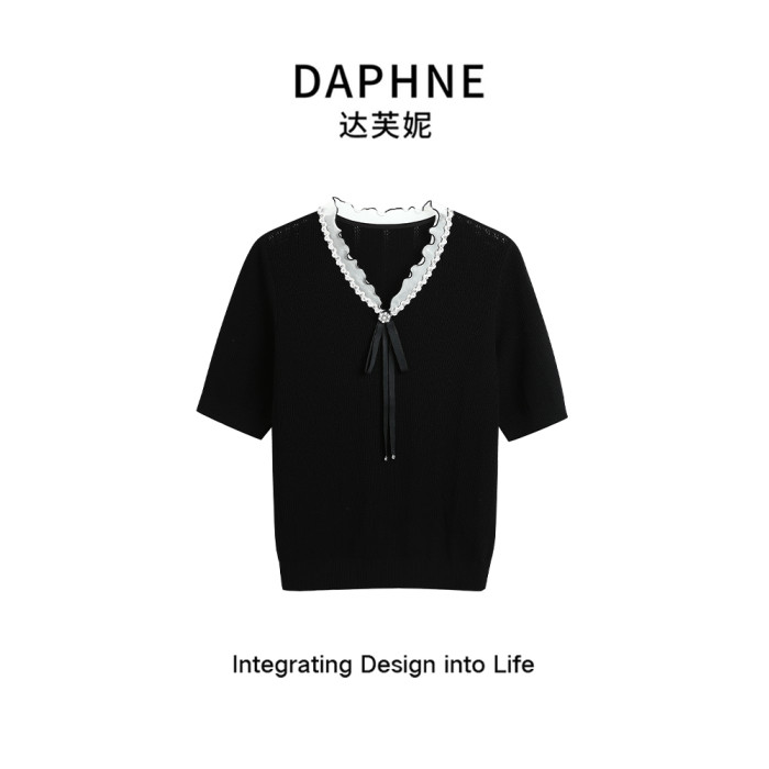 達芙妮/法式蝴蝶結花邊2025夏季短袖針織衫T恤女薄款修身上衣黑色