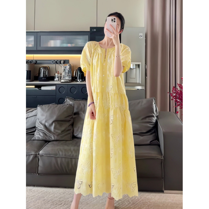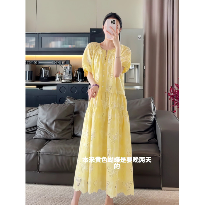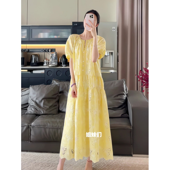 黃色泡泡袖蕾鏤空襯衫連衣裙設計感精緻仙女長裙女夏天海邊度假風
