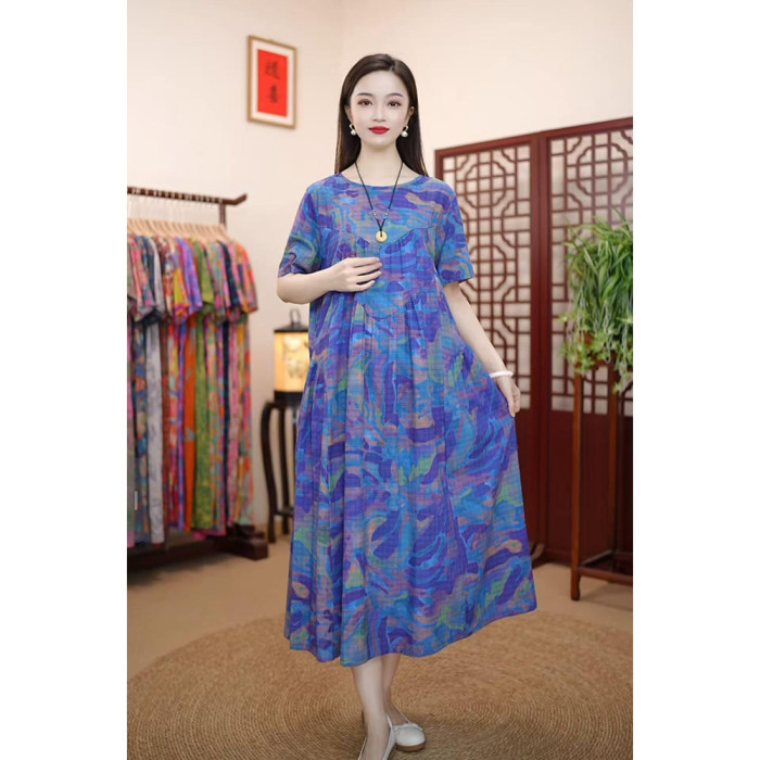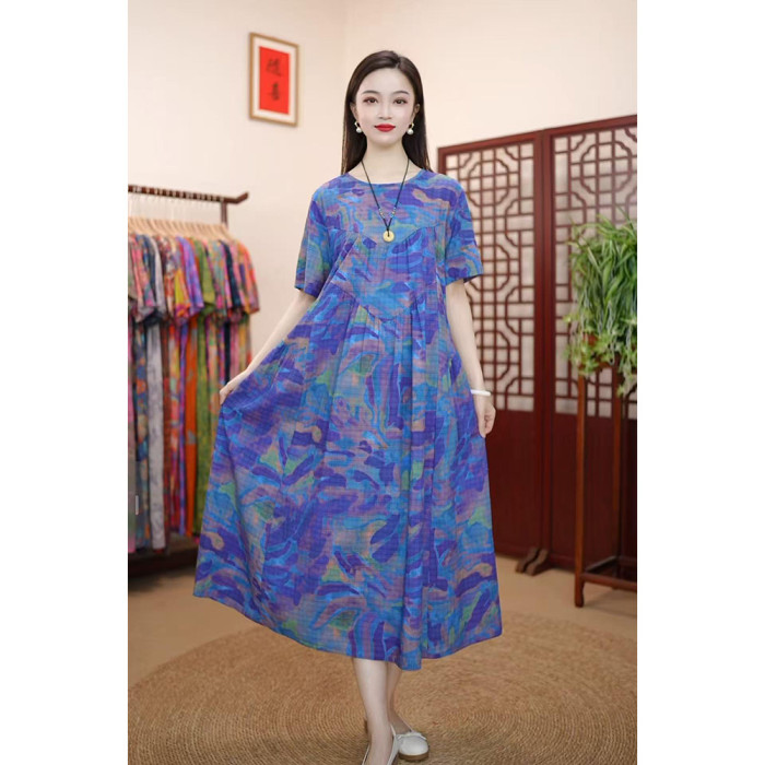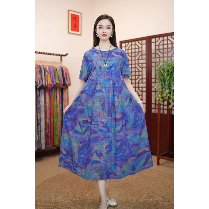 夏季新款高級氣質棉麻柔軟遮肚寬松顯瘦連衣裙子媽媽裝倒三角棉麻