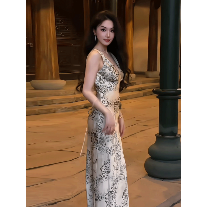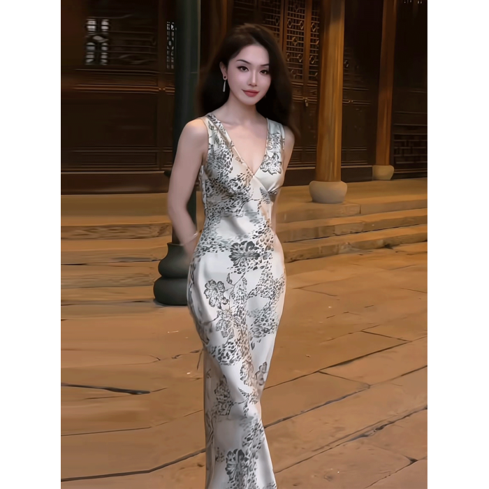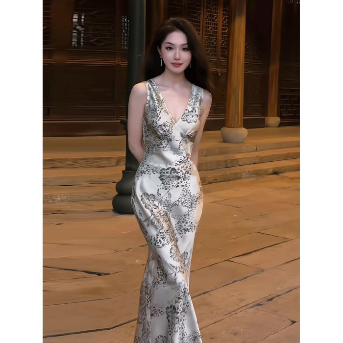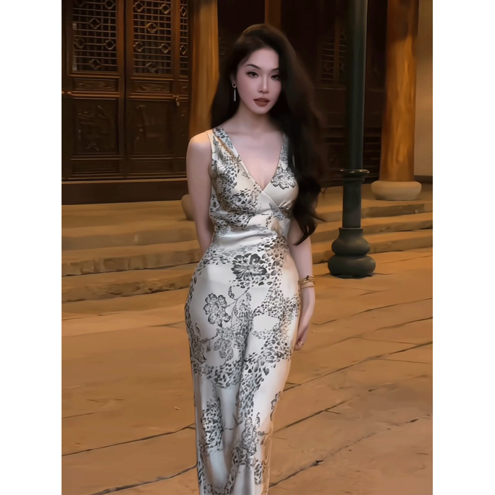 純欲性感名媛輕奢連衣裙女2025夏季新款法式優雅絕美無袖V領長裙