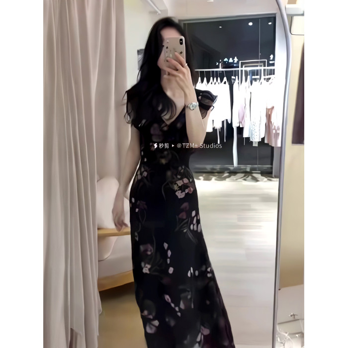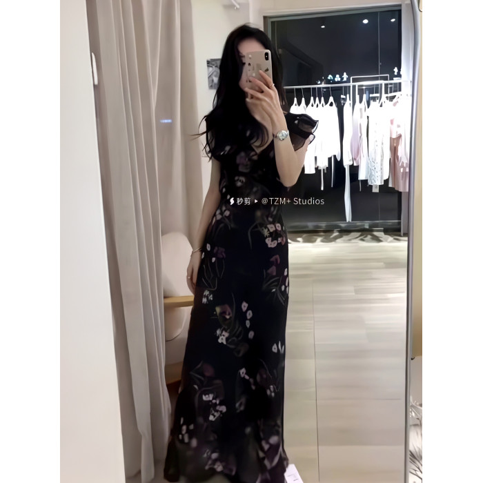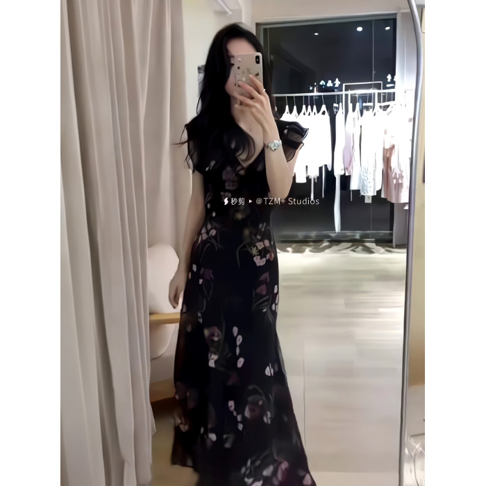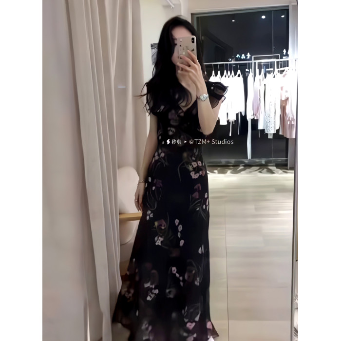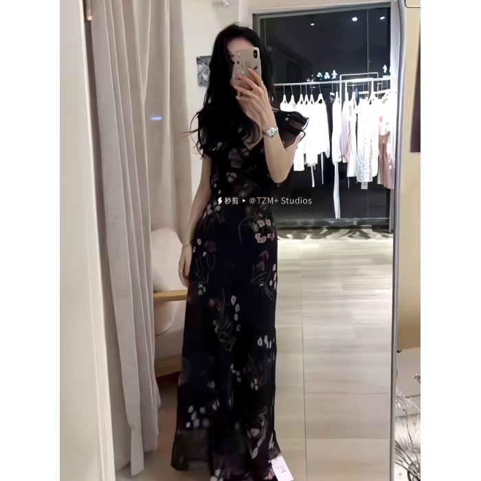 2025小個子顯高~黑色雪紡連衣裙小飛袖碎花長裙子垂感修身顯瘦ins
