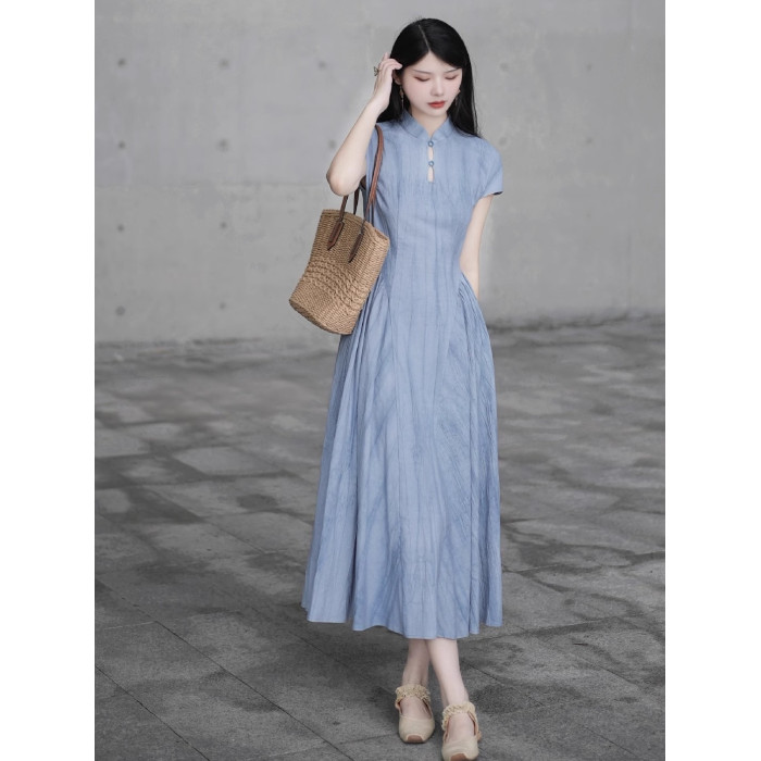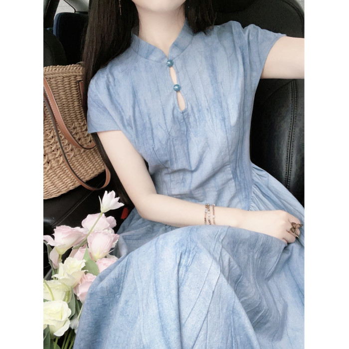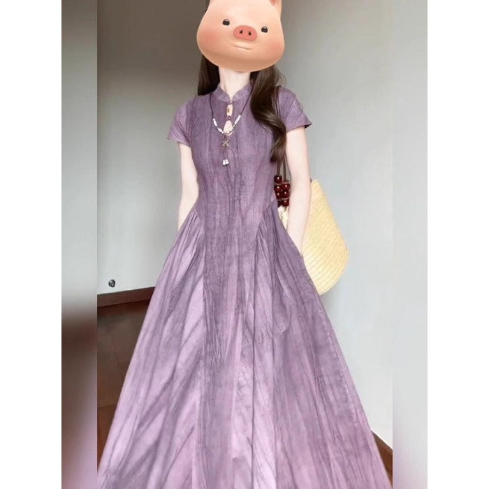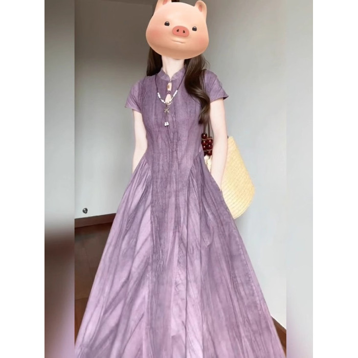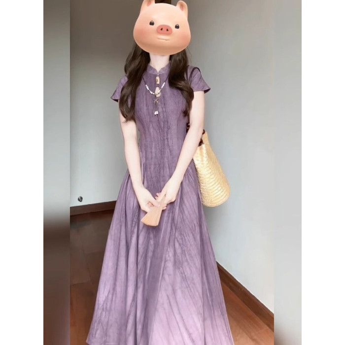 簡單大方的連衣裙女夏2025藍色新中式國風紫色收腰顯瘦改良旗袍