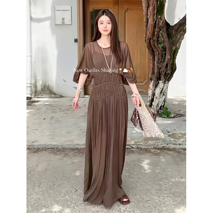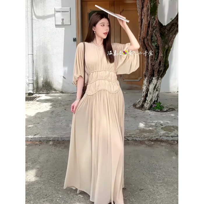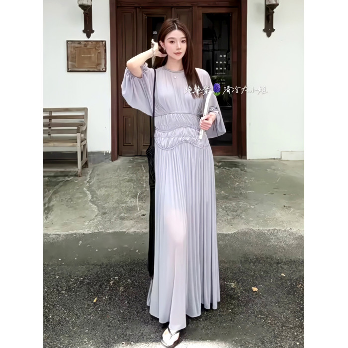 2025夏季 復古氣質長款燈籠袖薄款收腰連衣裙高級感紗絲腰封長裙