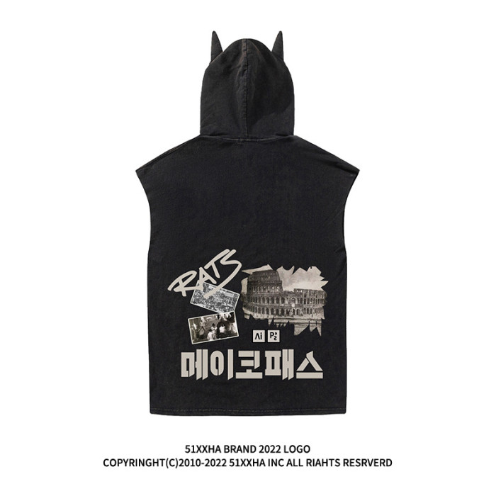 vintage復古年代懷舊印花連帽背心男款夏季hiphop運動健身無袖T恤