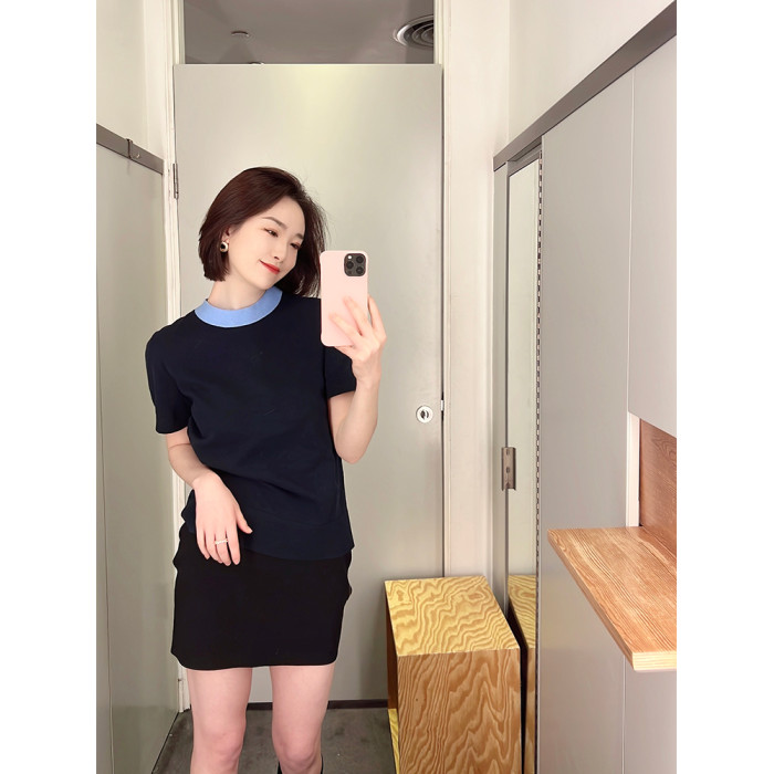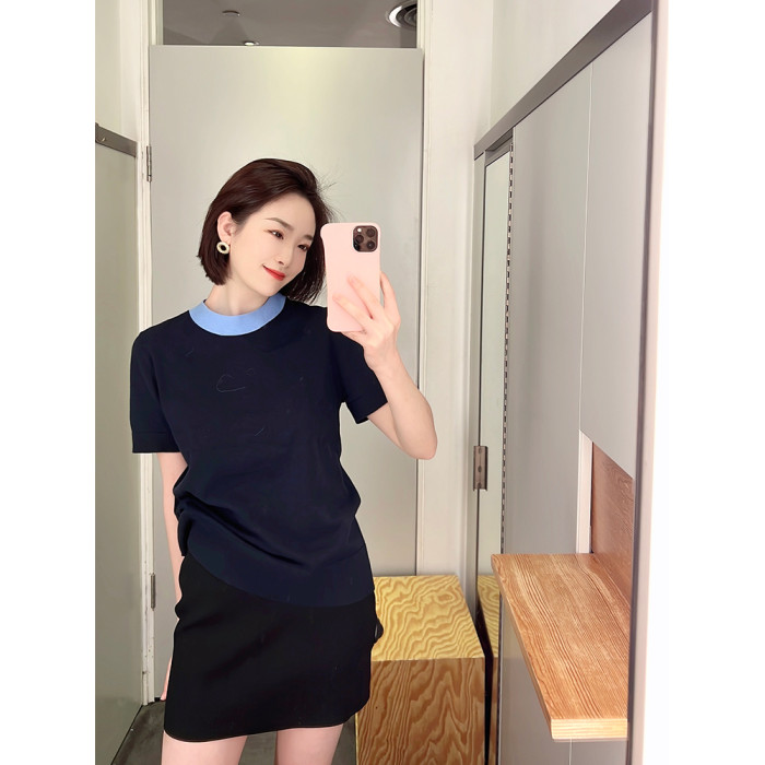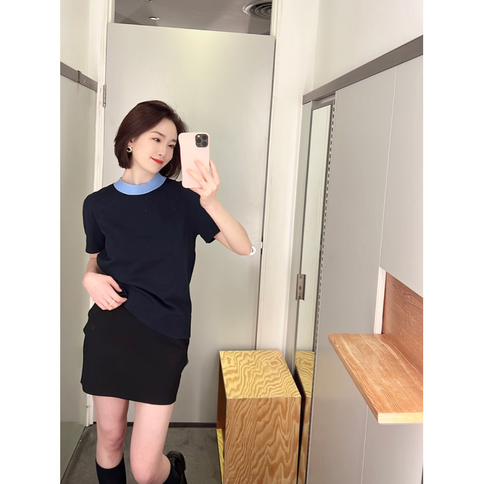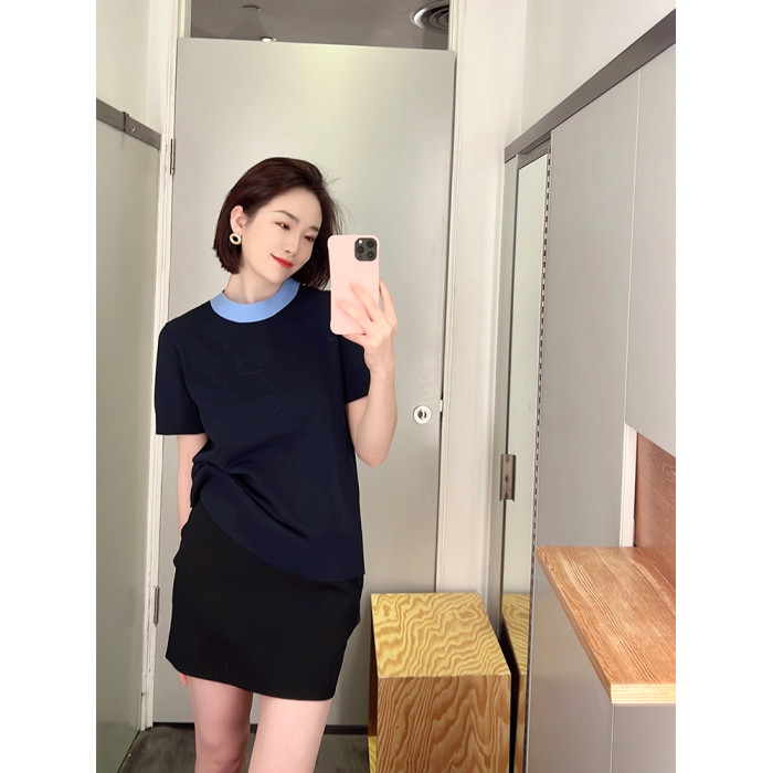 COS風2024春夏新款氣質圓領撞色短袖針織衫上衣女寬松小衆打底衫