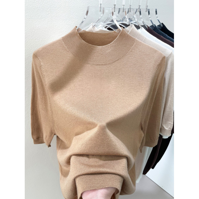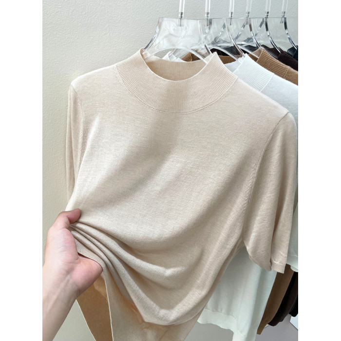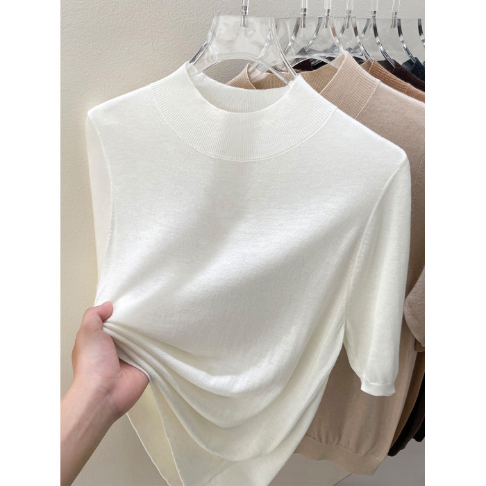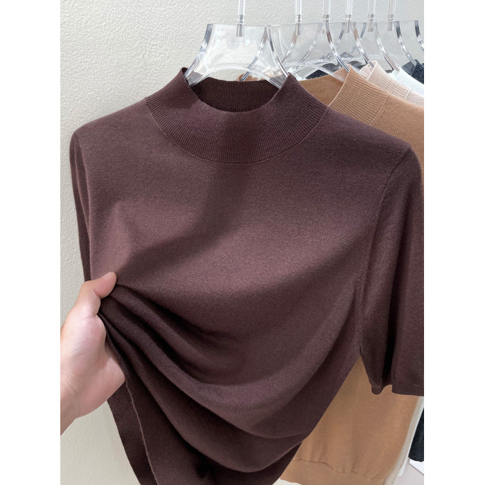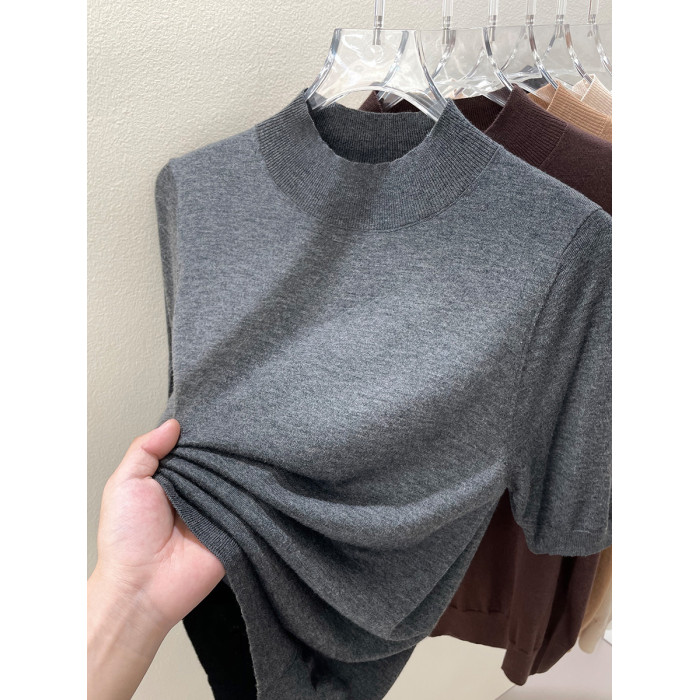 春秋2025新款別致半高領中袖針織打底衫上衣女寬松高級感灰色毛衣
