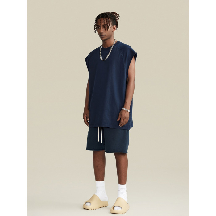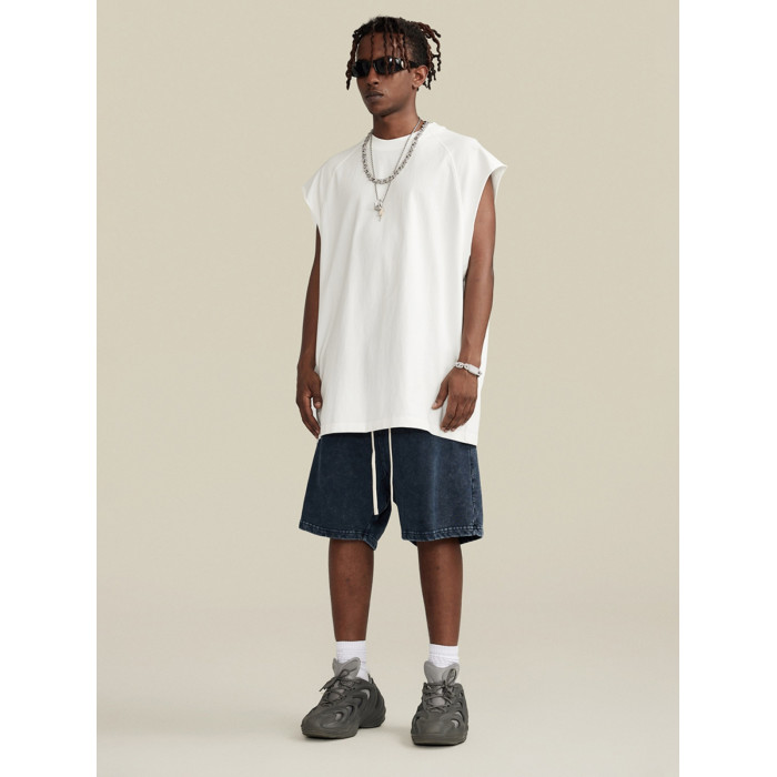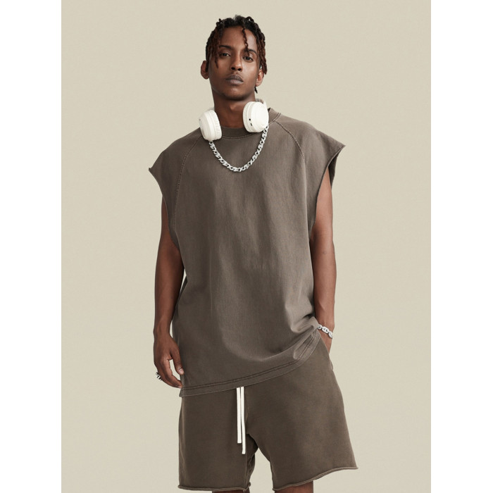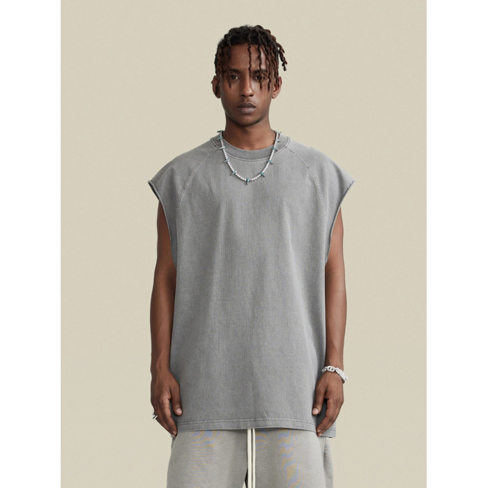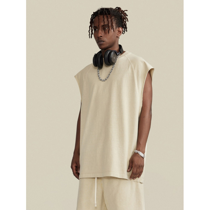 275g重磅美式街頭復古水洗做舊小領口圓領無袖T恤背心打底坎肩男