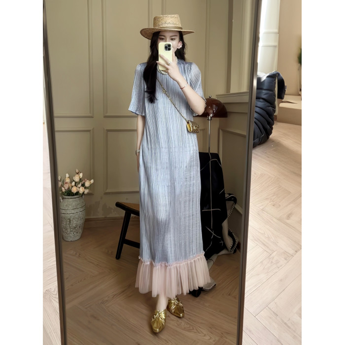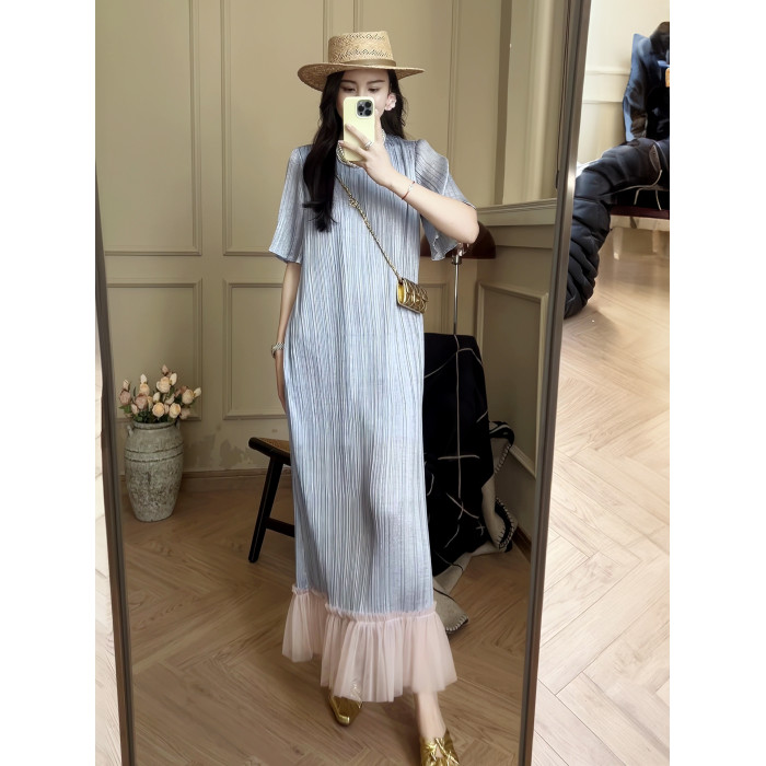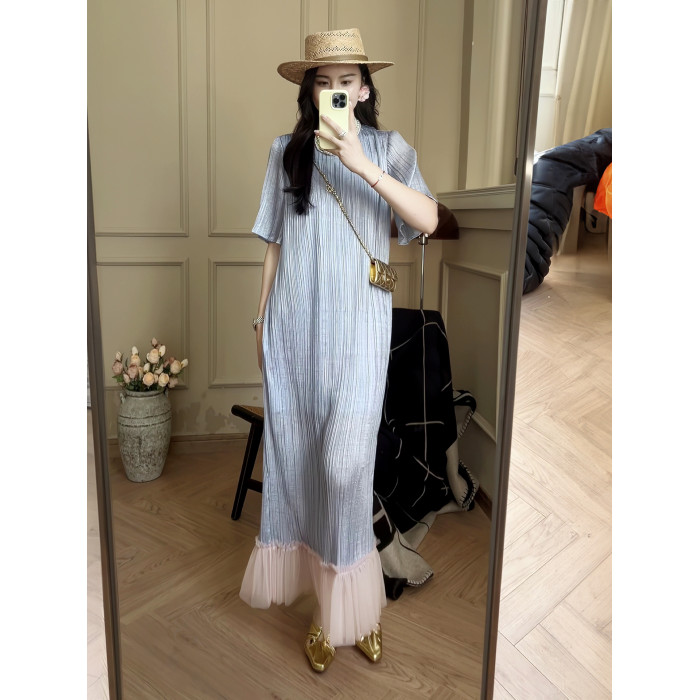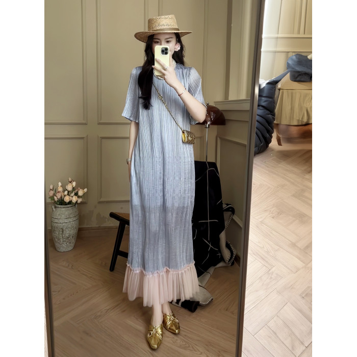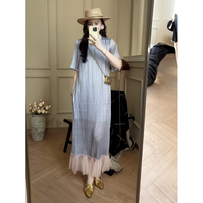 2025新款超火夏獨特漂亮法式褶皺短袖拼接長裙絕美氣質藍色連衣裙