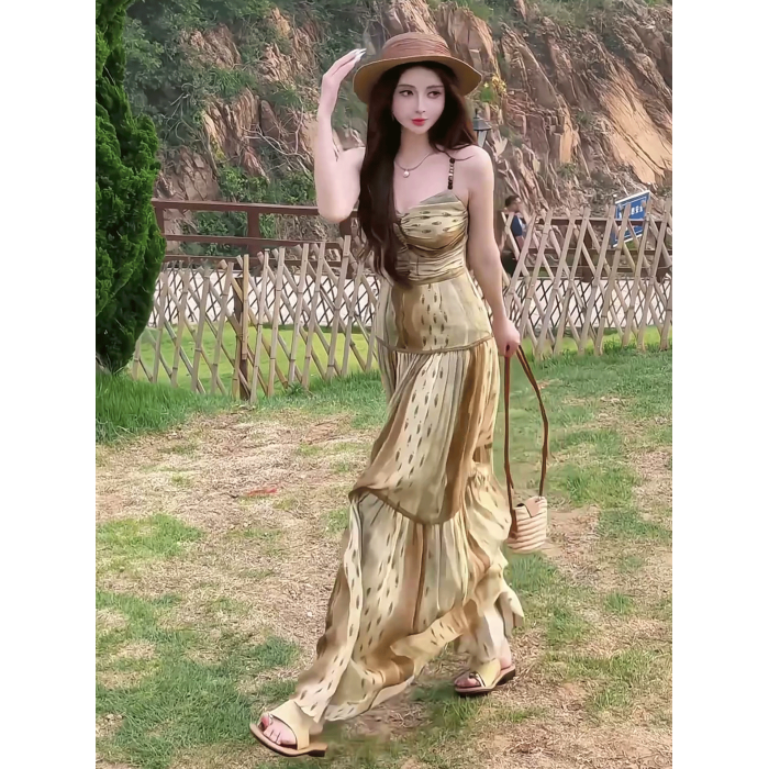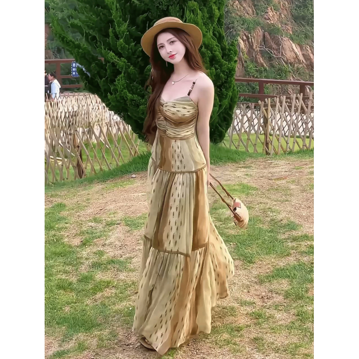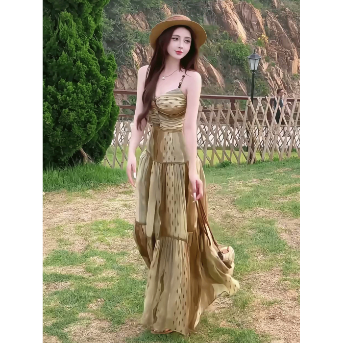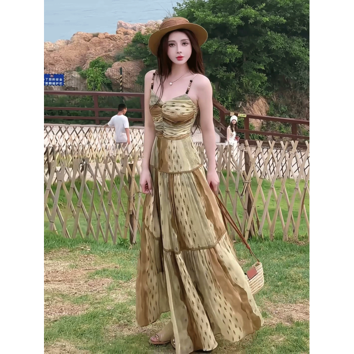 波西米亞度假風復古印花吊帶連衣裙女2025年夏季新款時尚氣質長裙