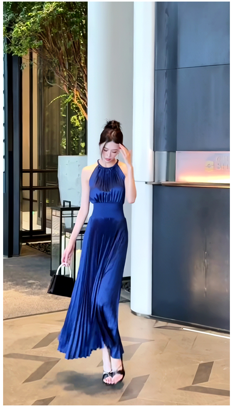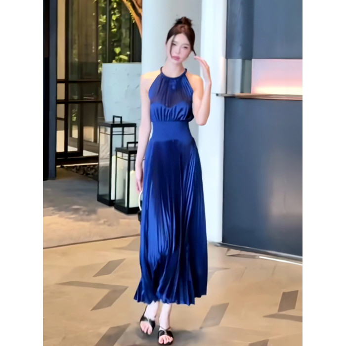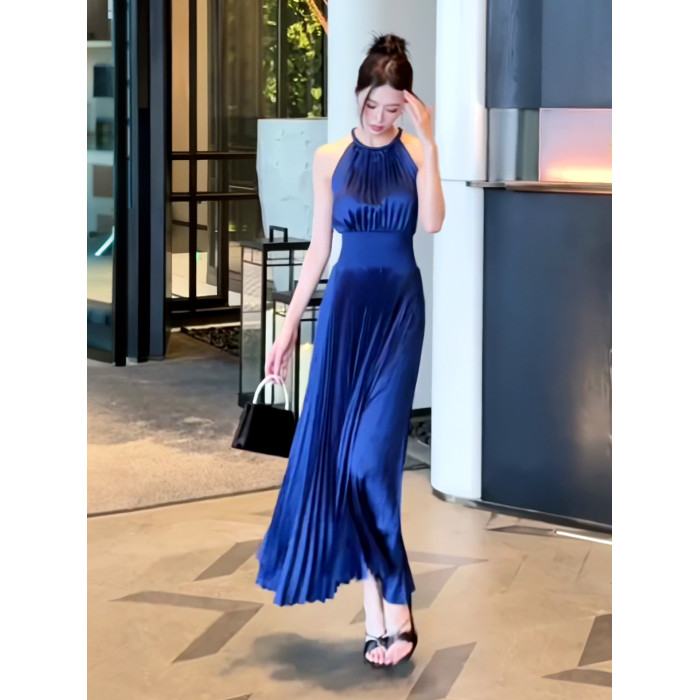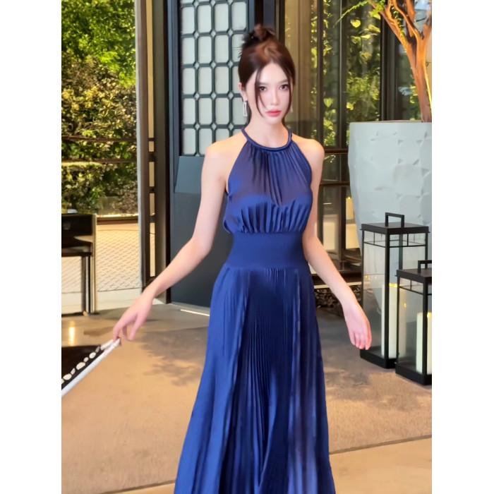 名媛風無袖掛脖露背連衣裙女裝2025年夏季新款高彈收腰百褶大擺裙