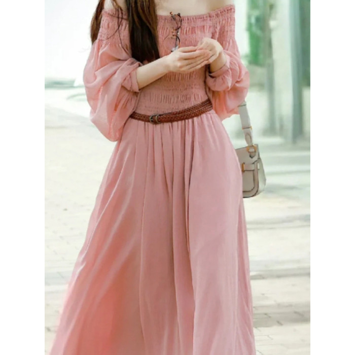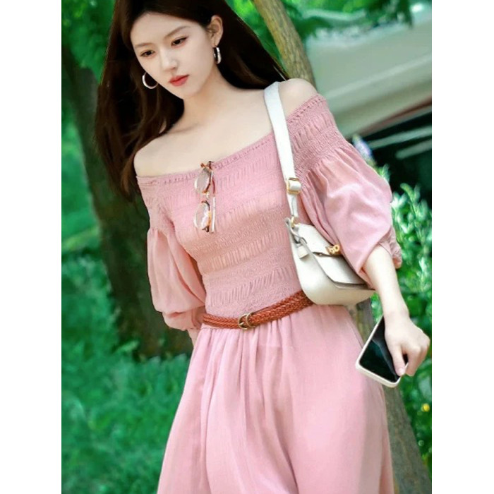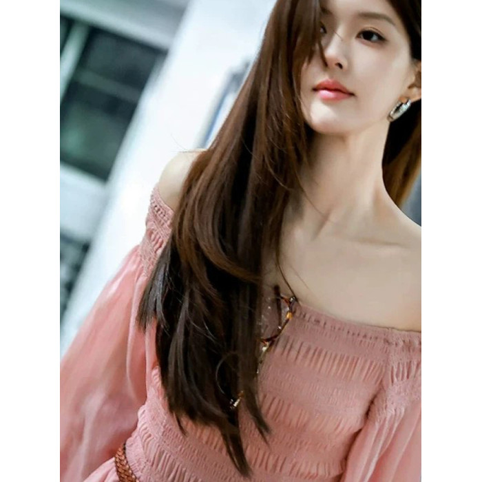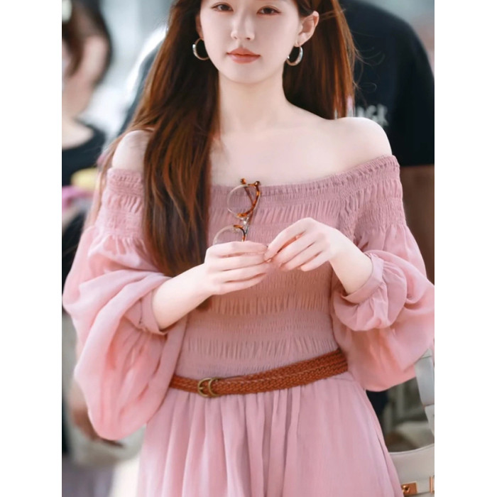 女薄款長袖法式氣質顯瘦長裙趙露思同款粉色一字肩連衣裙女2025夏