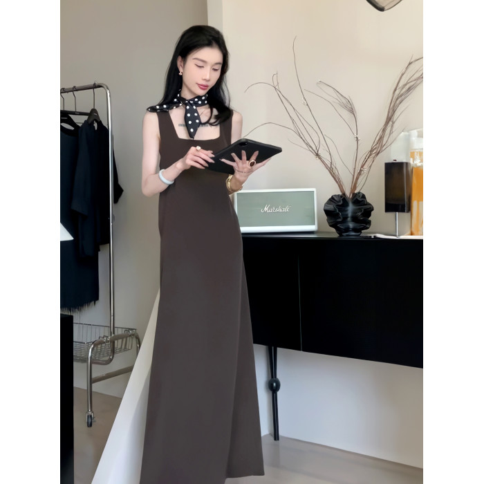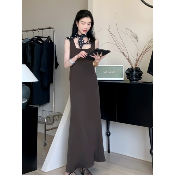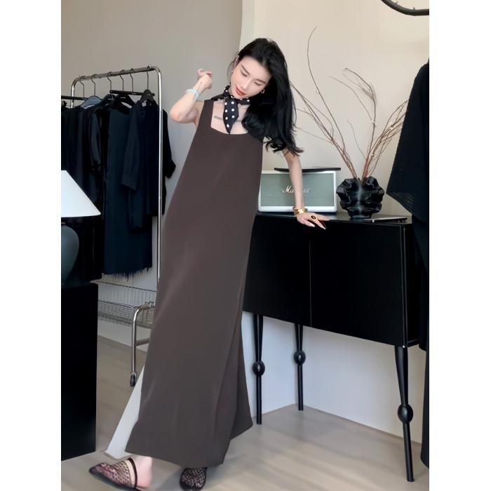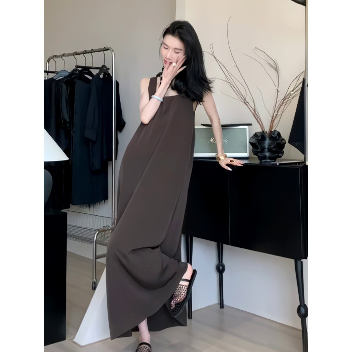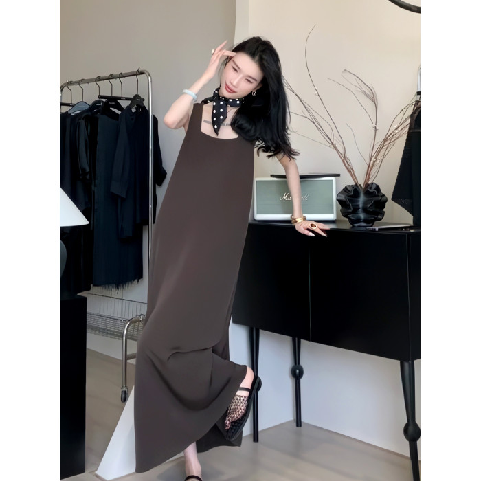 夏季方領無袖背心連衣裙女交叉露背寬松顯瘦長裙子簡約高級感女裝