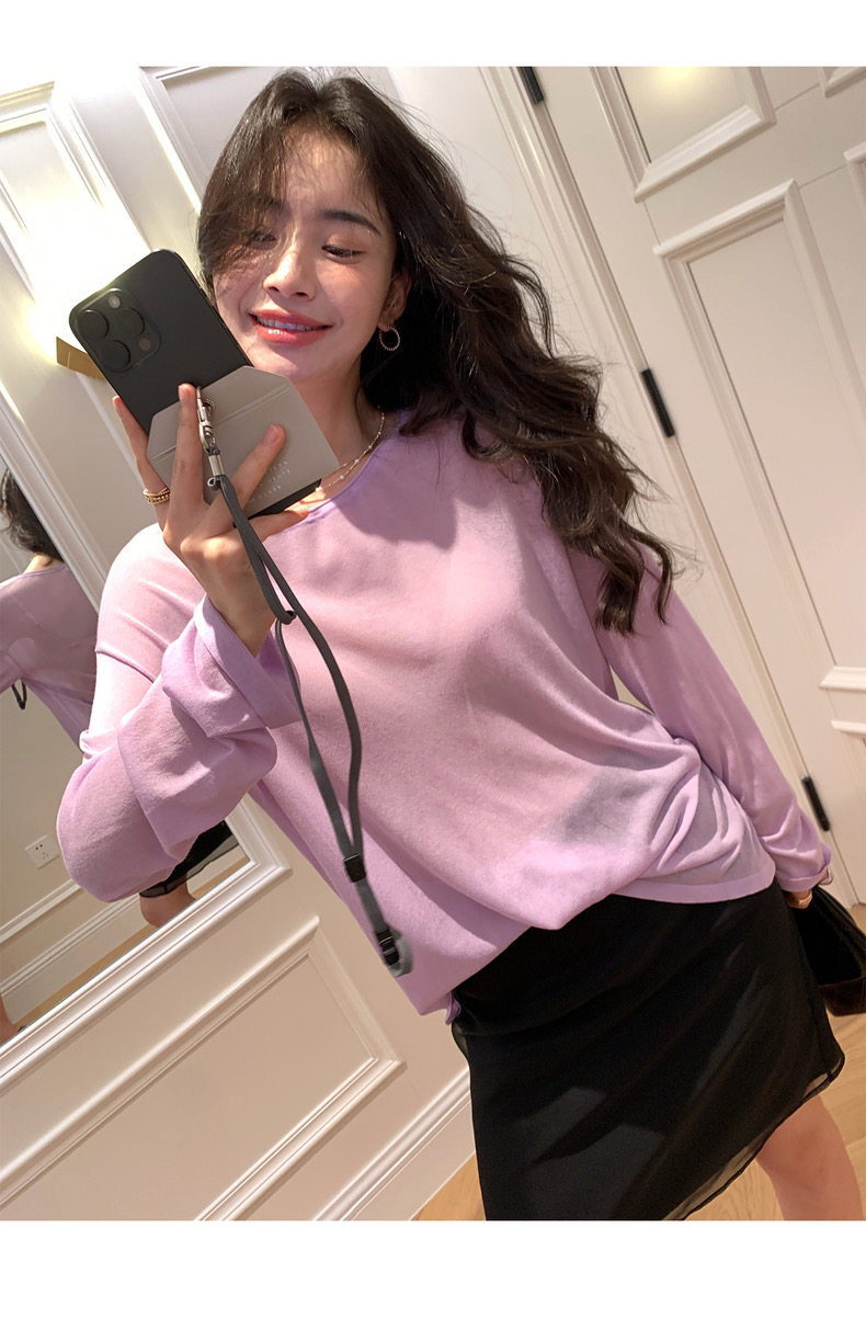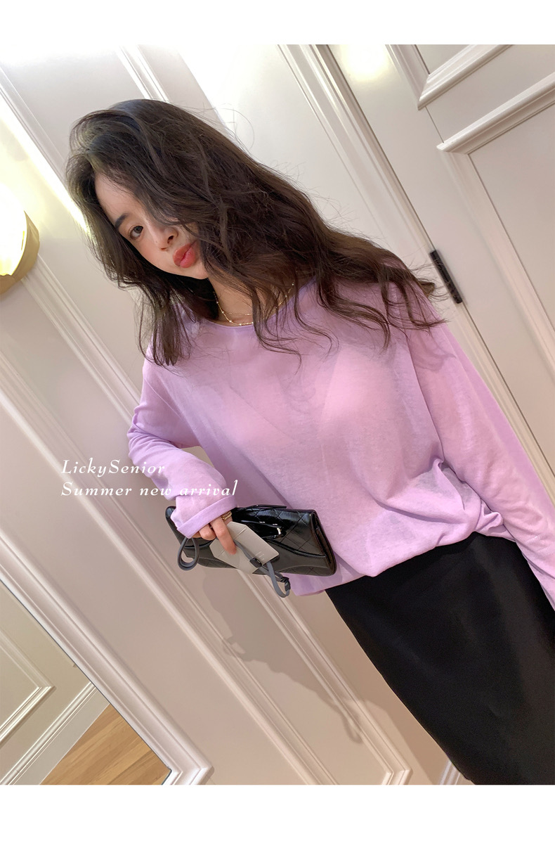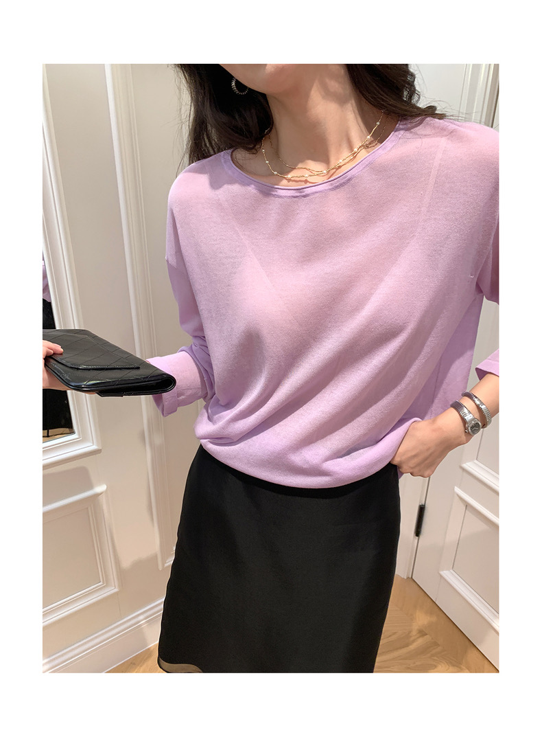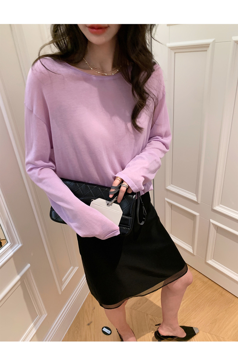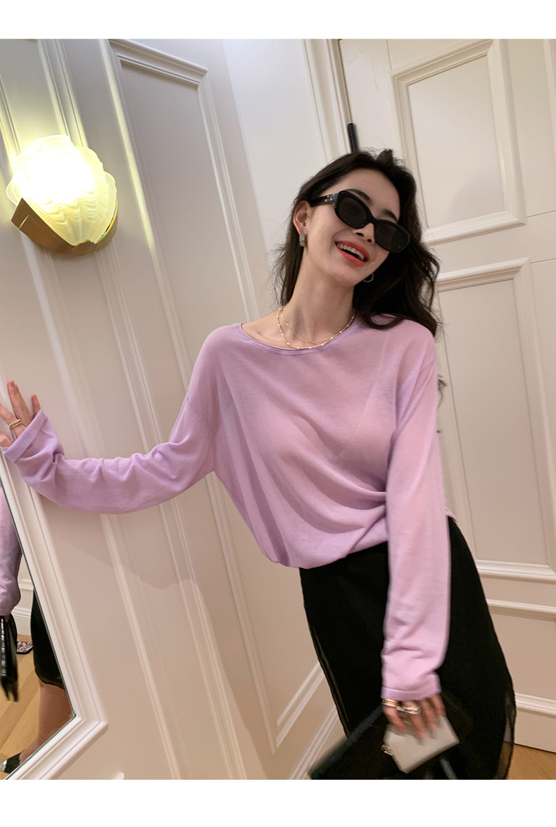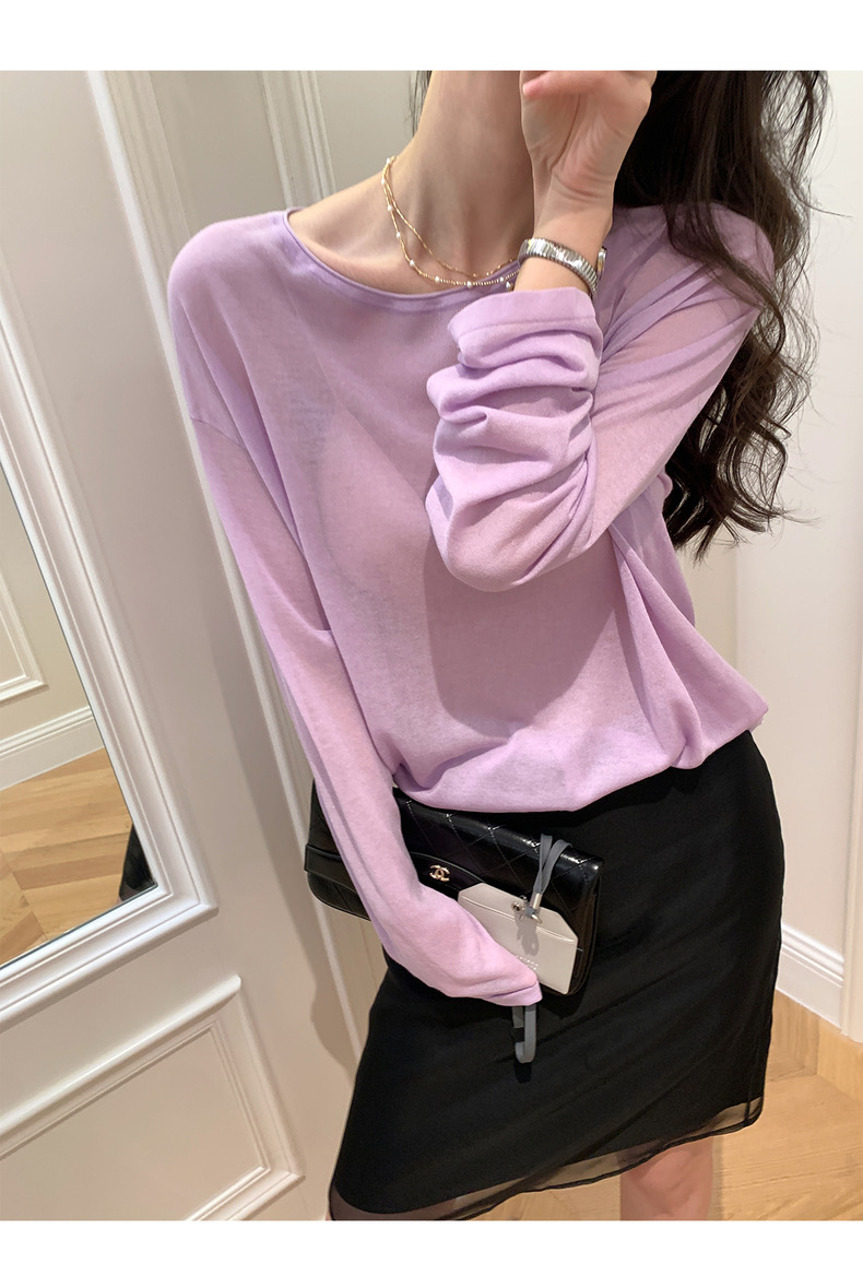 薄款圓領微透超細天絲針織打底衫女寬松紫色防曬衫長袖顯瘦罩衫
