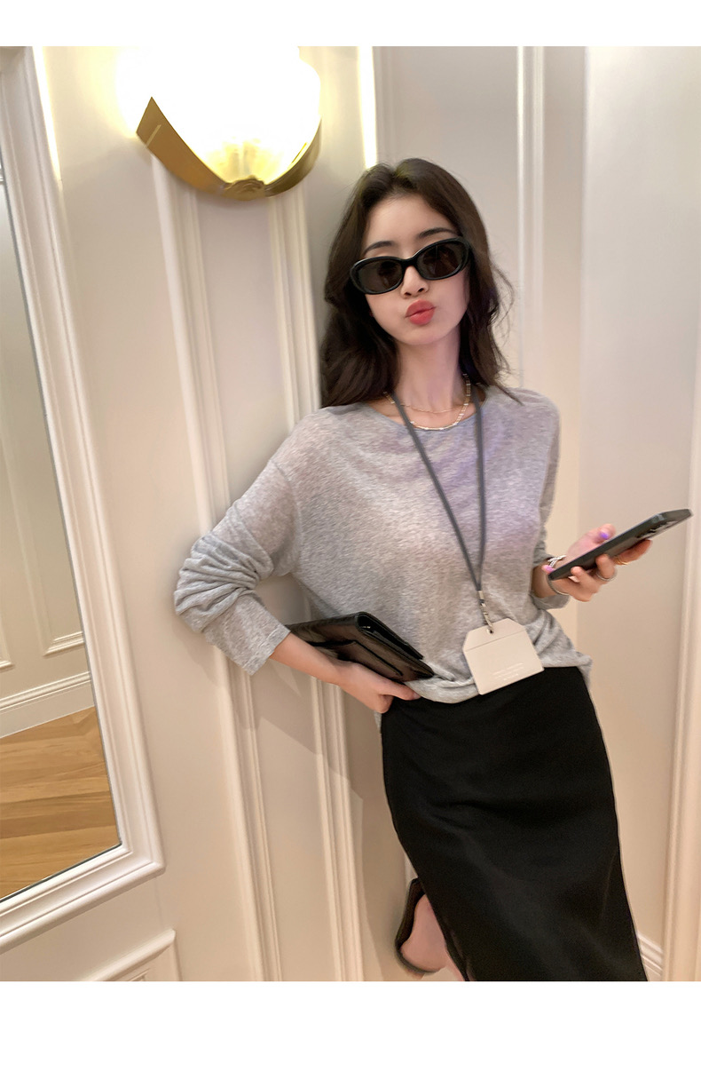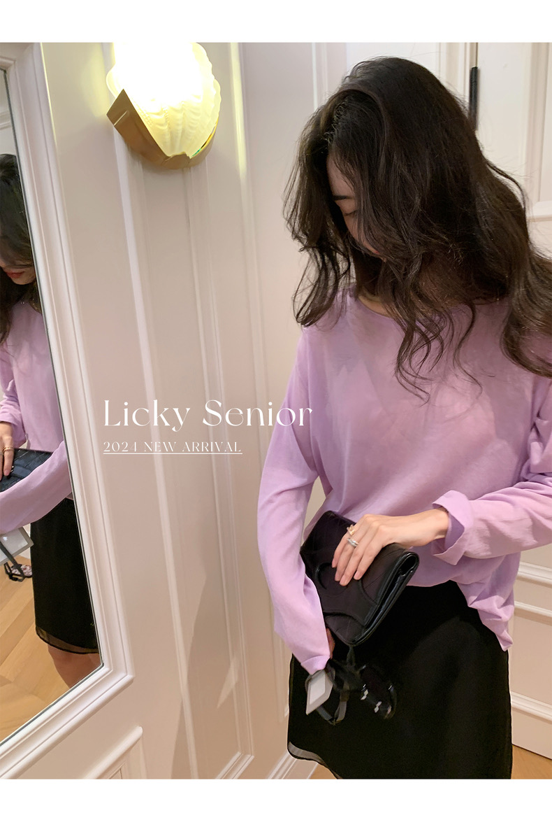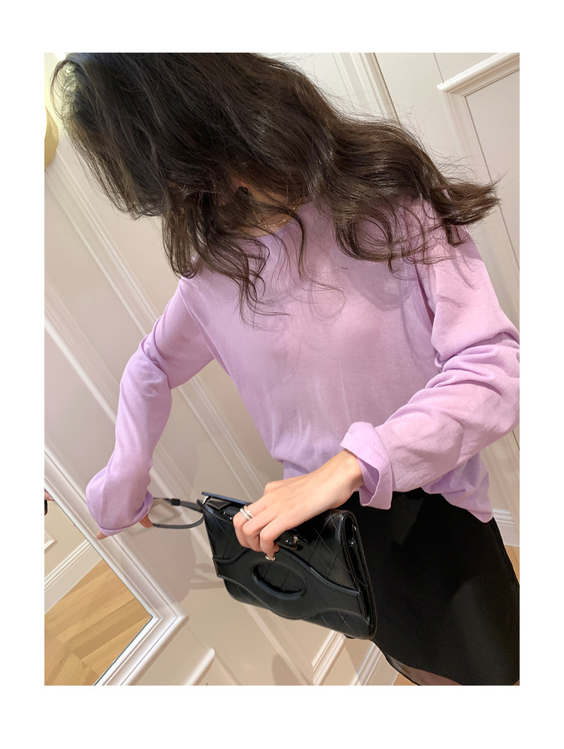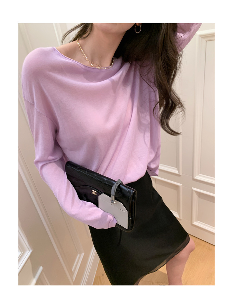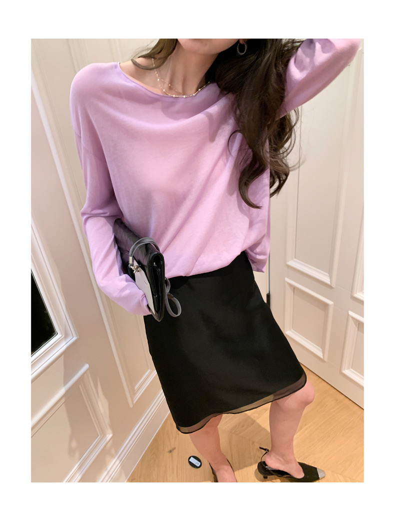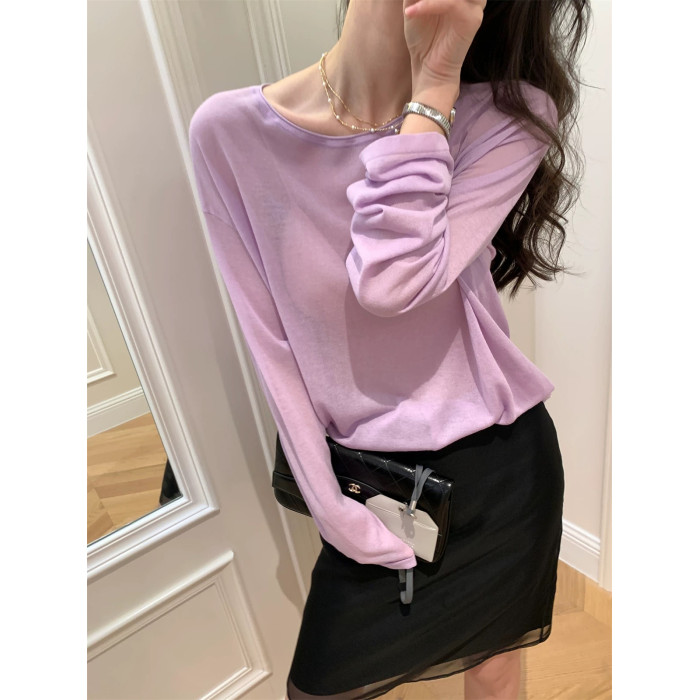 薄款圓領微透超細天絲針織打底衫女寬松紫色防曬衫長袖顯瘦罩衫