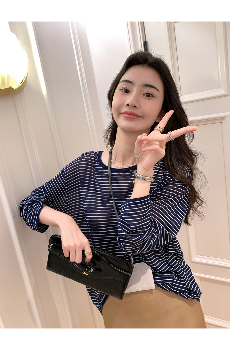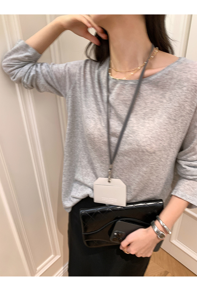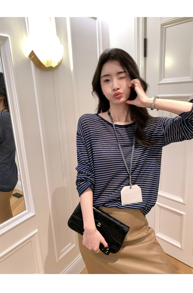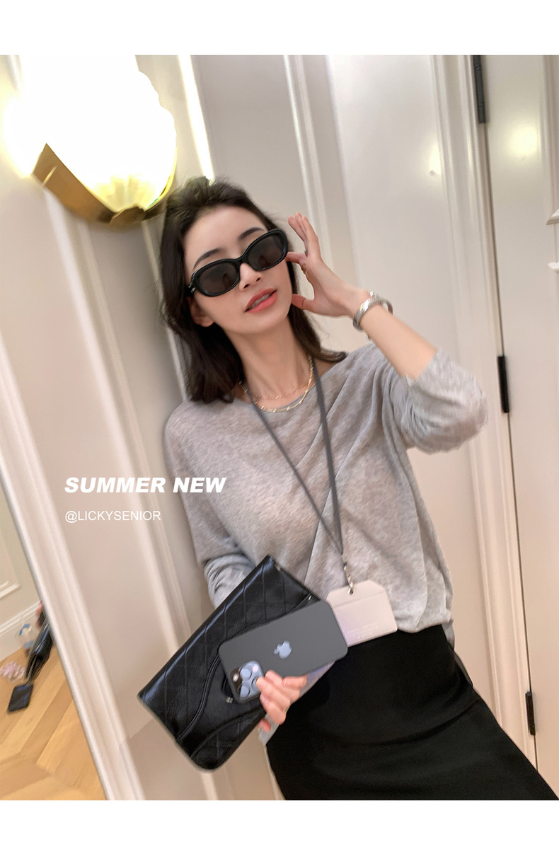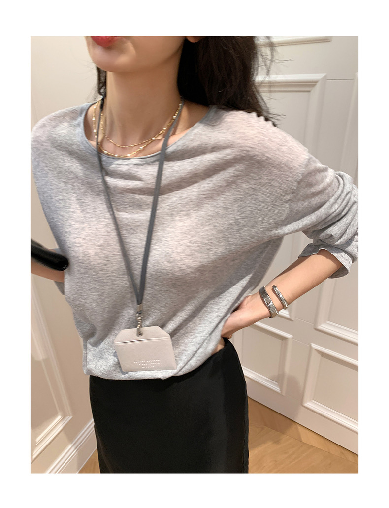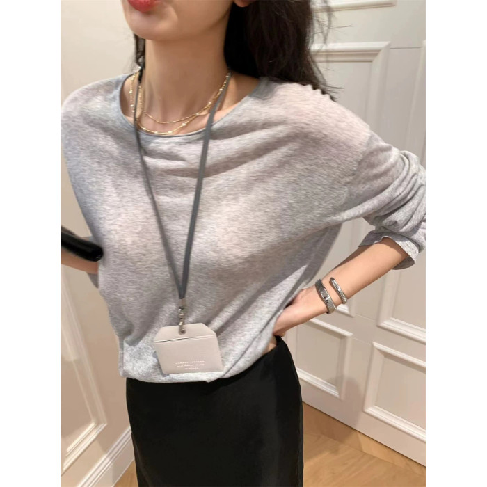 薄款圓領微透超細天絲針織打底衫女寬松紫色防曬衫長袖顯瘦罩衫