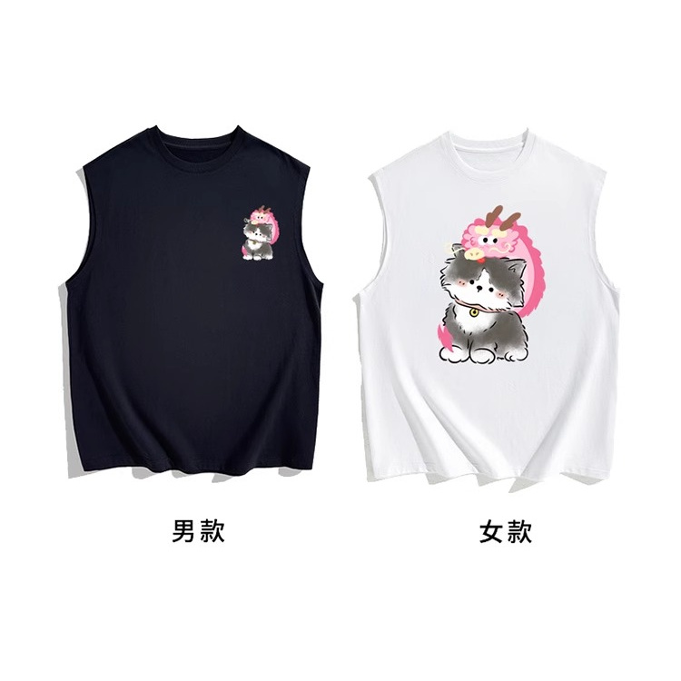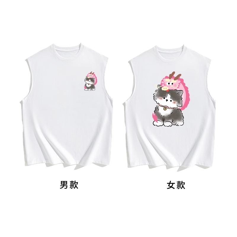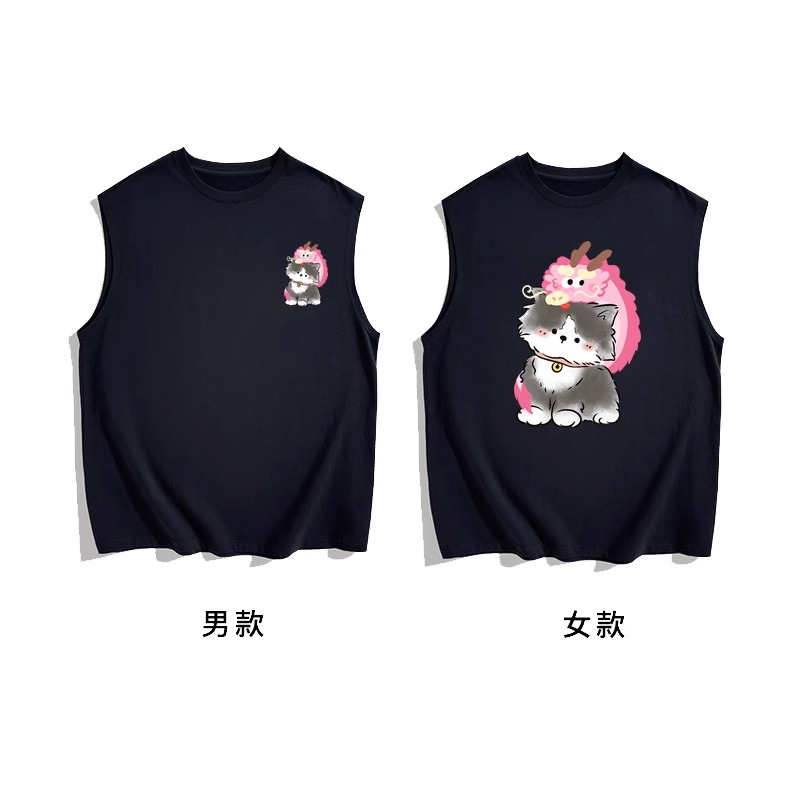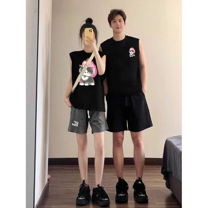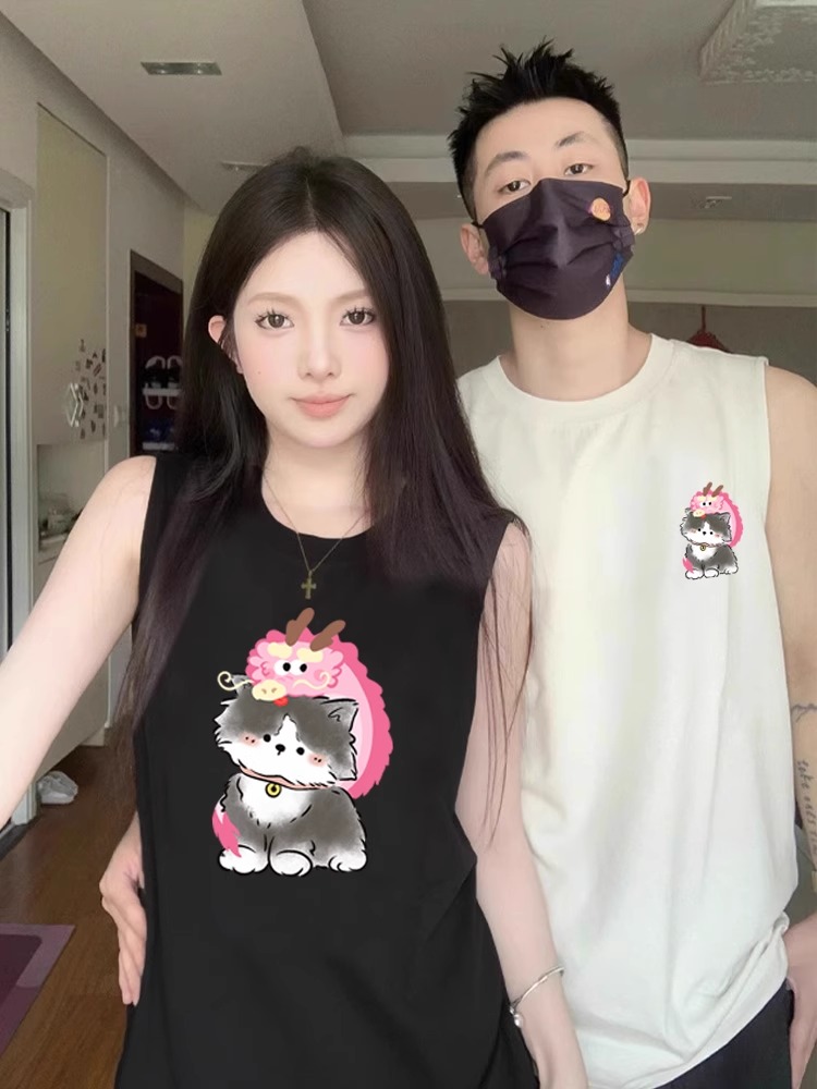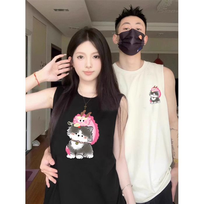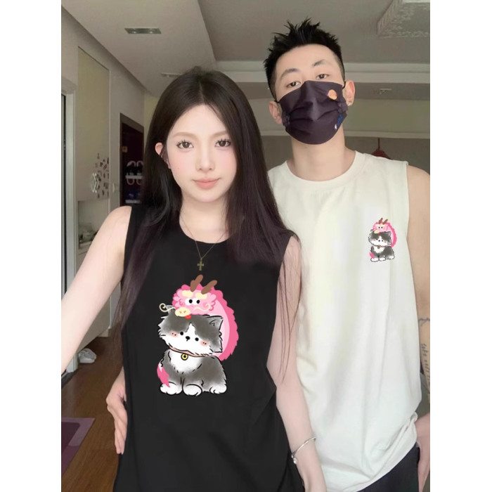情侶裝無袖T恤夏季玫紅色情侶貓咪套裝網紅高級感ins純棉背心兩件